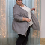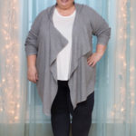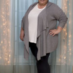 BB Dakota blanket cardigan via Gwynnie Bee 3x; cream Gloria Vanderbilt Amanda jeans 24; Avenue grey silk-trimmed long-sleeved tee 26/28