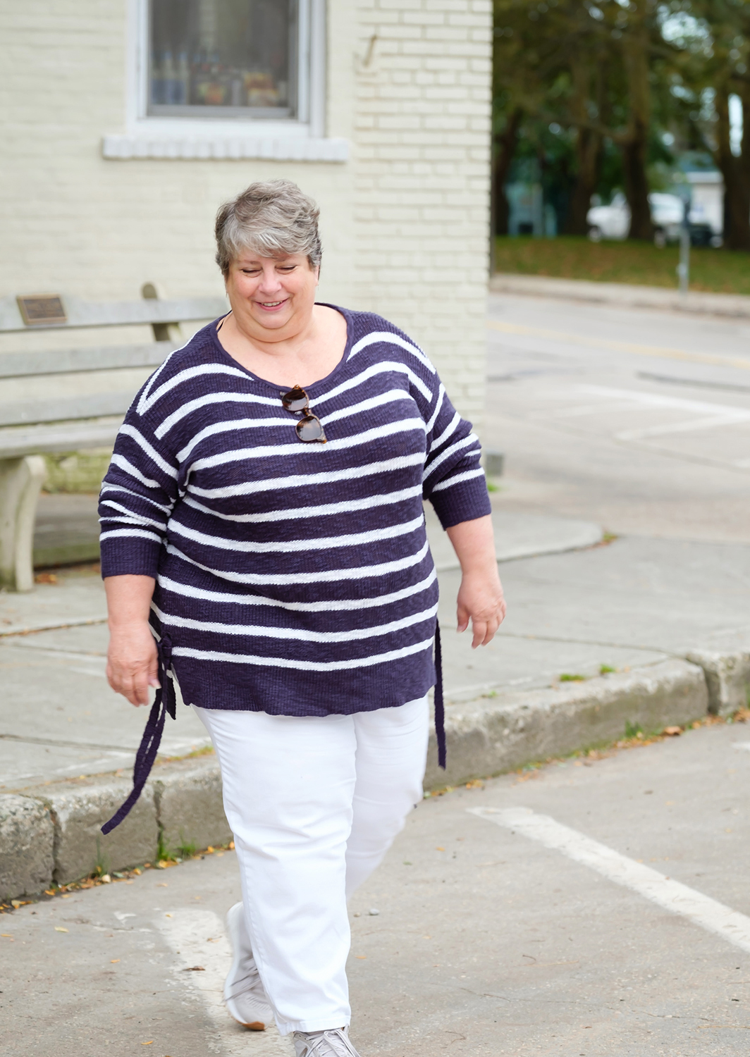 I had been watching and liking this navy and white stripe pullover on Nordstrom Rack since the fall of 2017. But it was too much money, too much money, too much money. It would go on sale, still too much money. It would go out of stock then come back in stock. I put it in my ShopTagr and just waited. I sorta forgot all about it. Then one day mid-summer I got a notification that it was on clearance for like TWELVE DOLLARS. Come on. I snatched that sucker right up. Success. The End. I love that story.