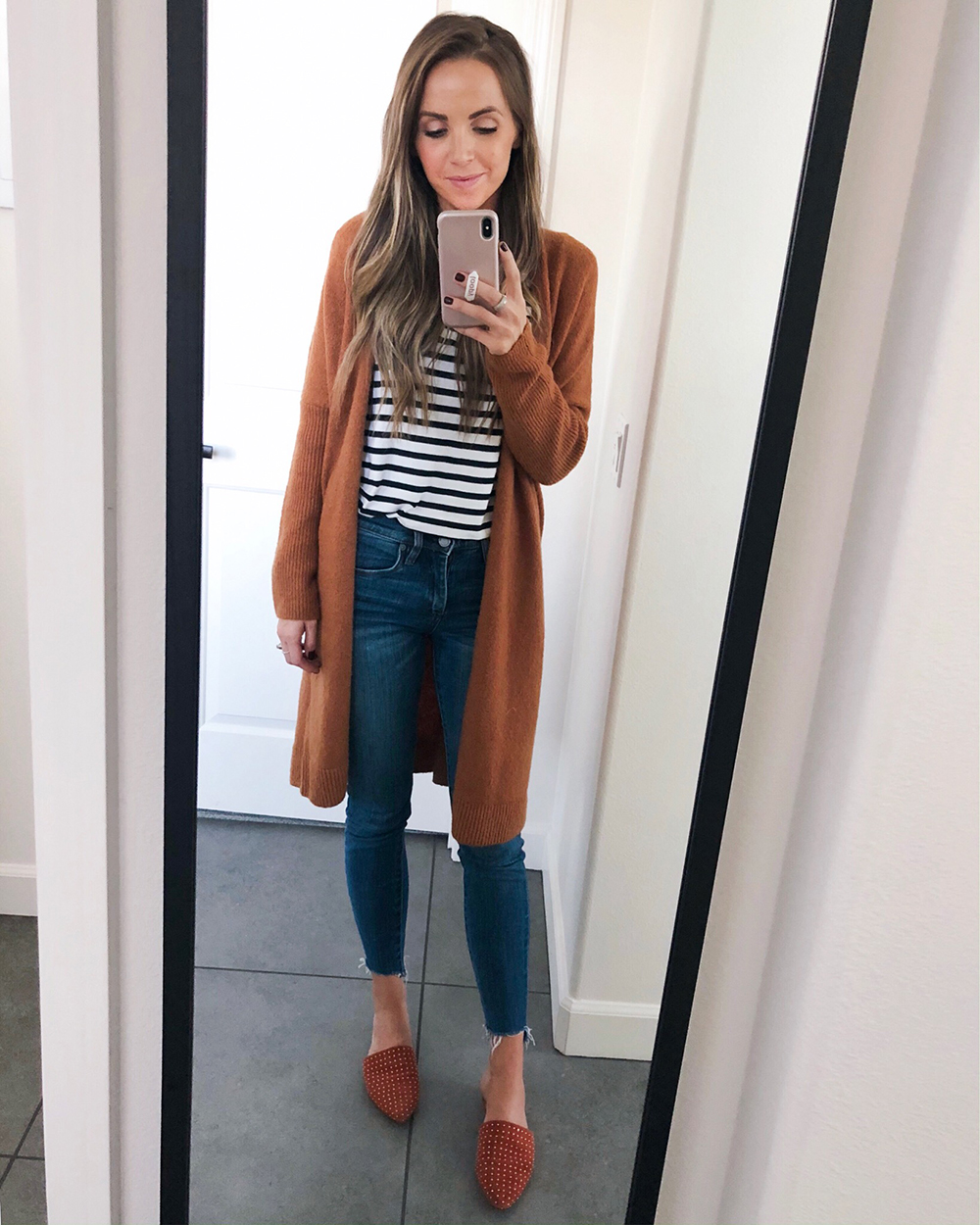 #1 I’ve been following Merrick of Merrick’s Art for ages and love her easy, timeless, modern style. And she sews! She has tons of sewing tutorials that I like to look at and go, yep, yep…just like watching yoga videos. Yep, that looks great. Maybe someday I’ll actually try one! But this outfit here is like the quintessential perfect everyday fall outfit to me. Black and white stripes, check…warm spicy long cardigan, check…easy skinny jeans, check…darling cinnamon slides, check check.
