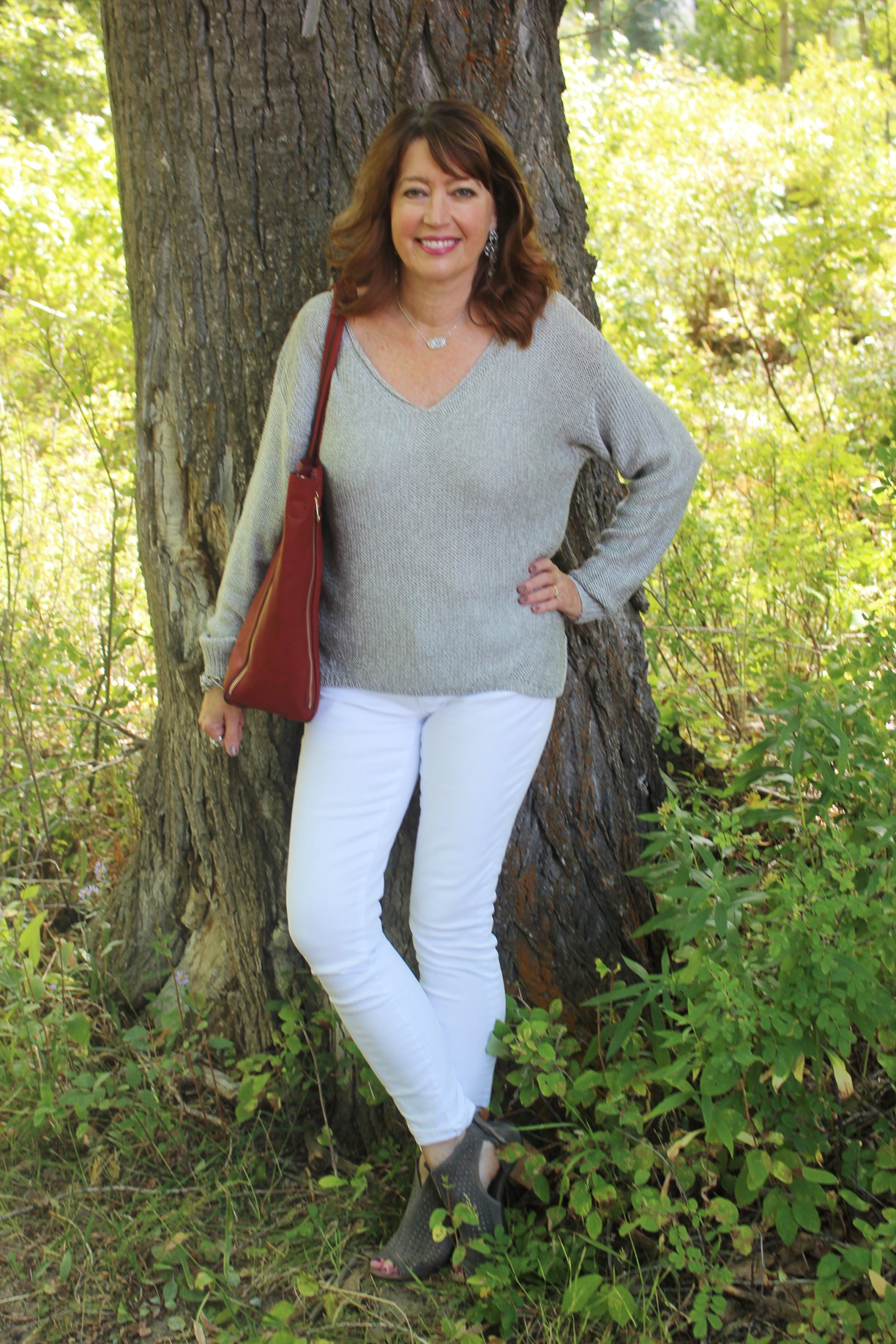 #3 And last but not least (these are not in any particular order), is Debbie from Gracefully Styled: An Over 50 Fashion & Style Blog. I’ve only recently discovered her blog and have enjoyed her modern, classic style. She’s wearing a favorite color combo of mine, grey and white. And I love the wine accent color in the bag.
