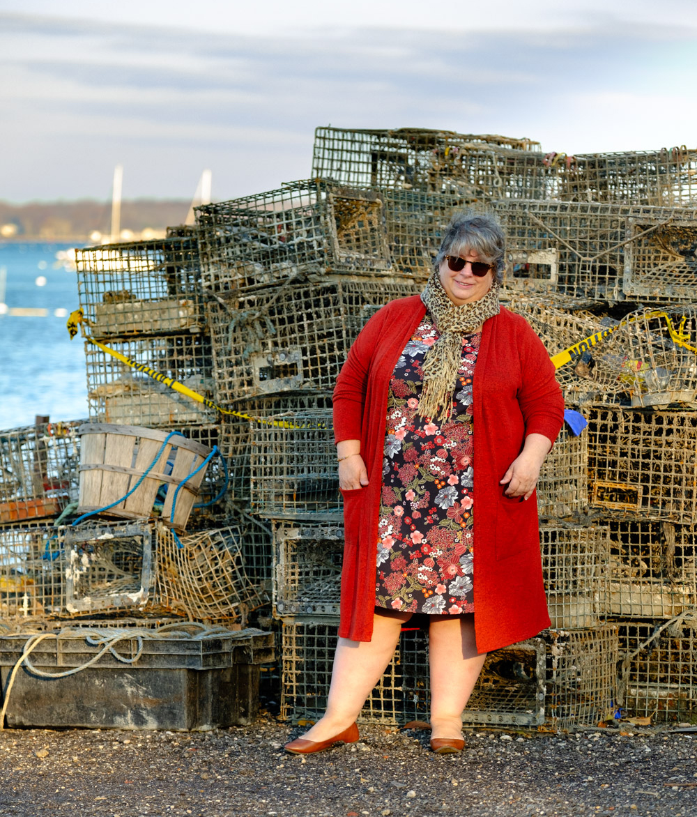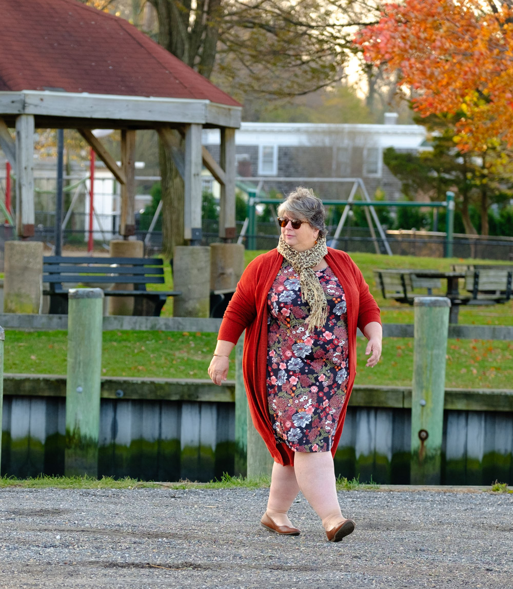 I don’t know if I’m going to wear this on Thanksgiving, but it is certainly giving me Thanksgiving vibes. This floral Ellos dress has all the autumn colors in it – burgundy, rust, gold, ochre, pink, grey, olive green. It goes with like every cardigan in my closet! And I loved this little touch of leopard in the scarf along with the floral. I can’t wait to wear this dress also with a denim jacket, I think that will be a great combo, too!