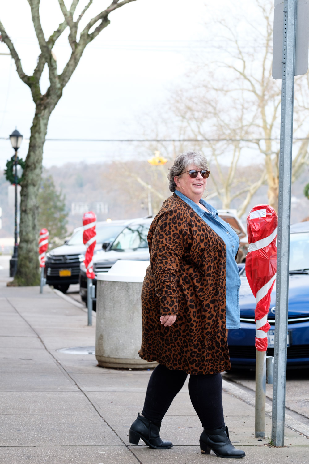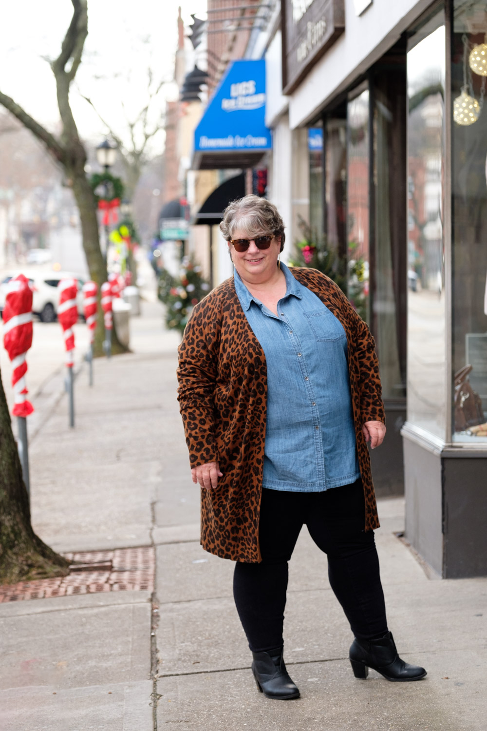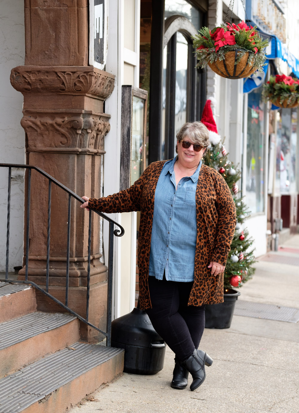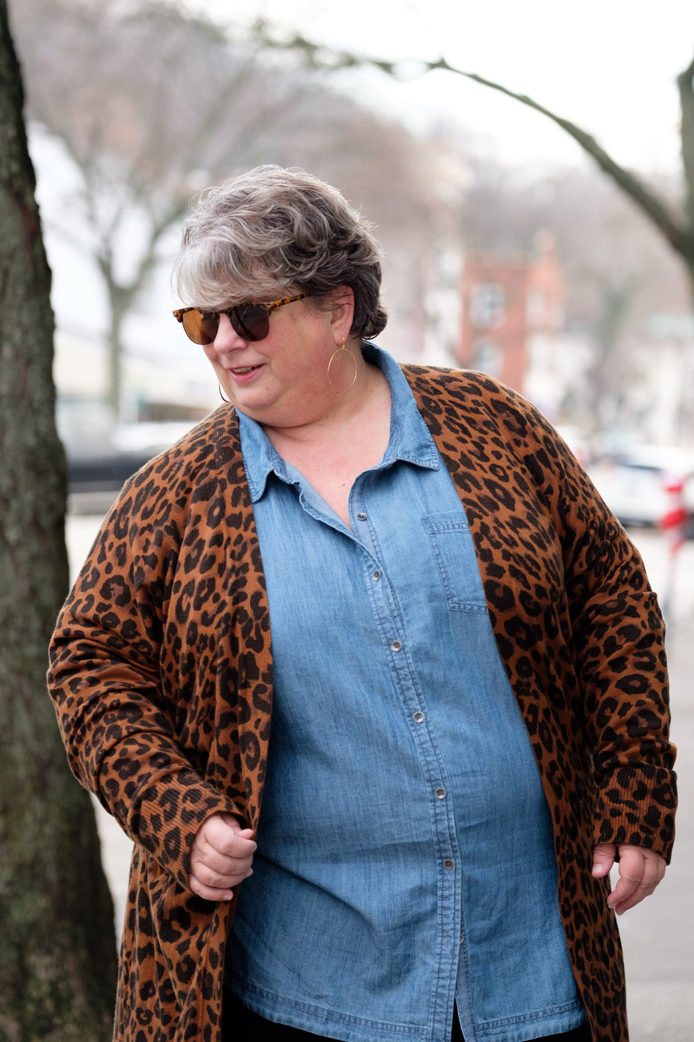 The denim shirt and medium-weight leopard cardigan are the perfect weight for me to be in and out of shops. Why do stores crank the heat up SO HIGH in the winter? Sure it might be cold outside, but inside, walking around, trying things on, lugging packages, surrounded by other shoppers?? I can barely stand to be inside stores…let alone an actual MALL. So a coat is out of the question for me when shopping/erranding, on all but the very coldest days.