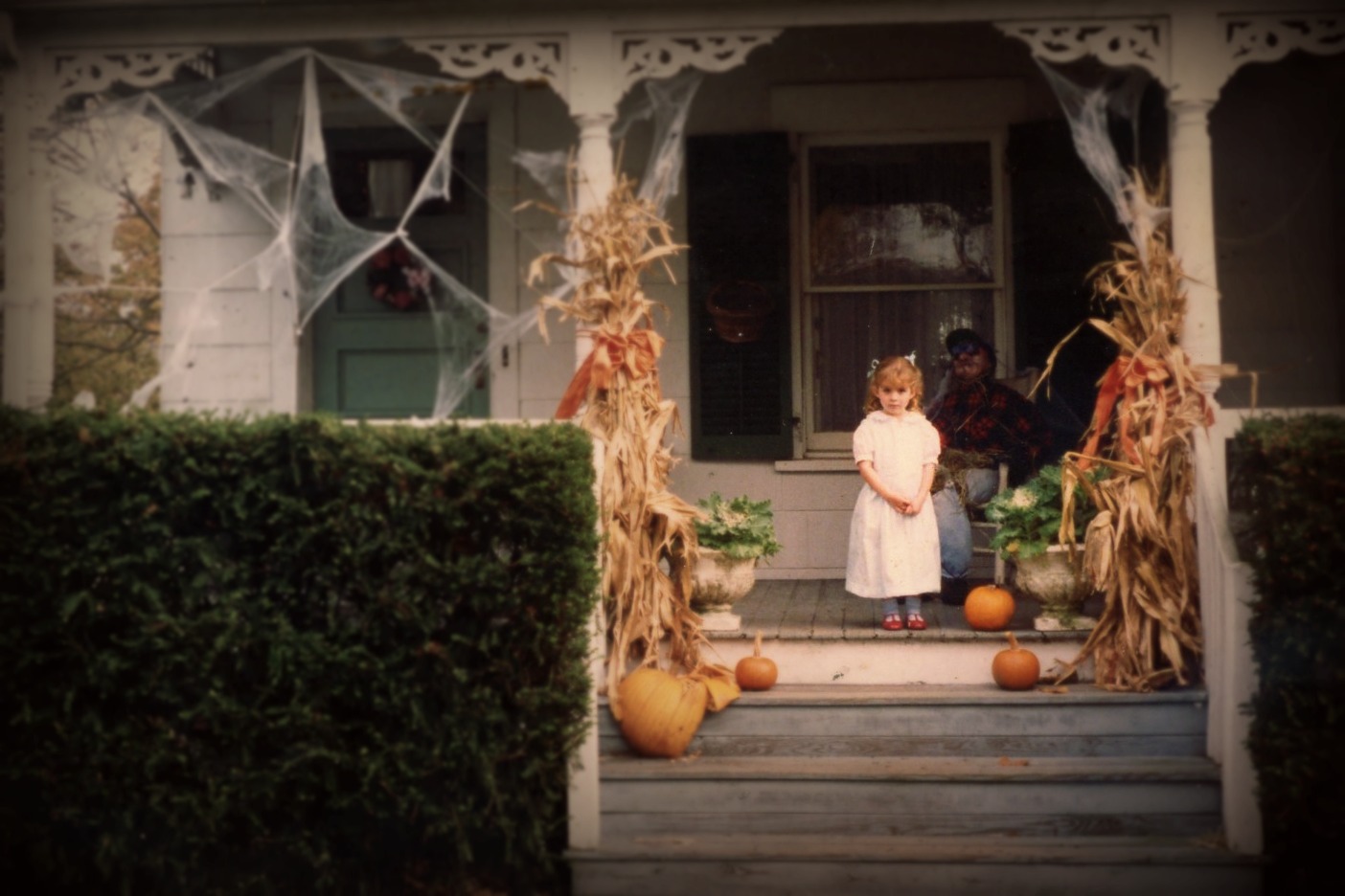 Here’s the front porch with the rocking chair behind (cute cute) Katie.