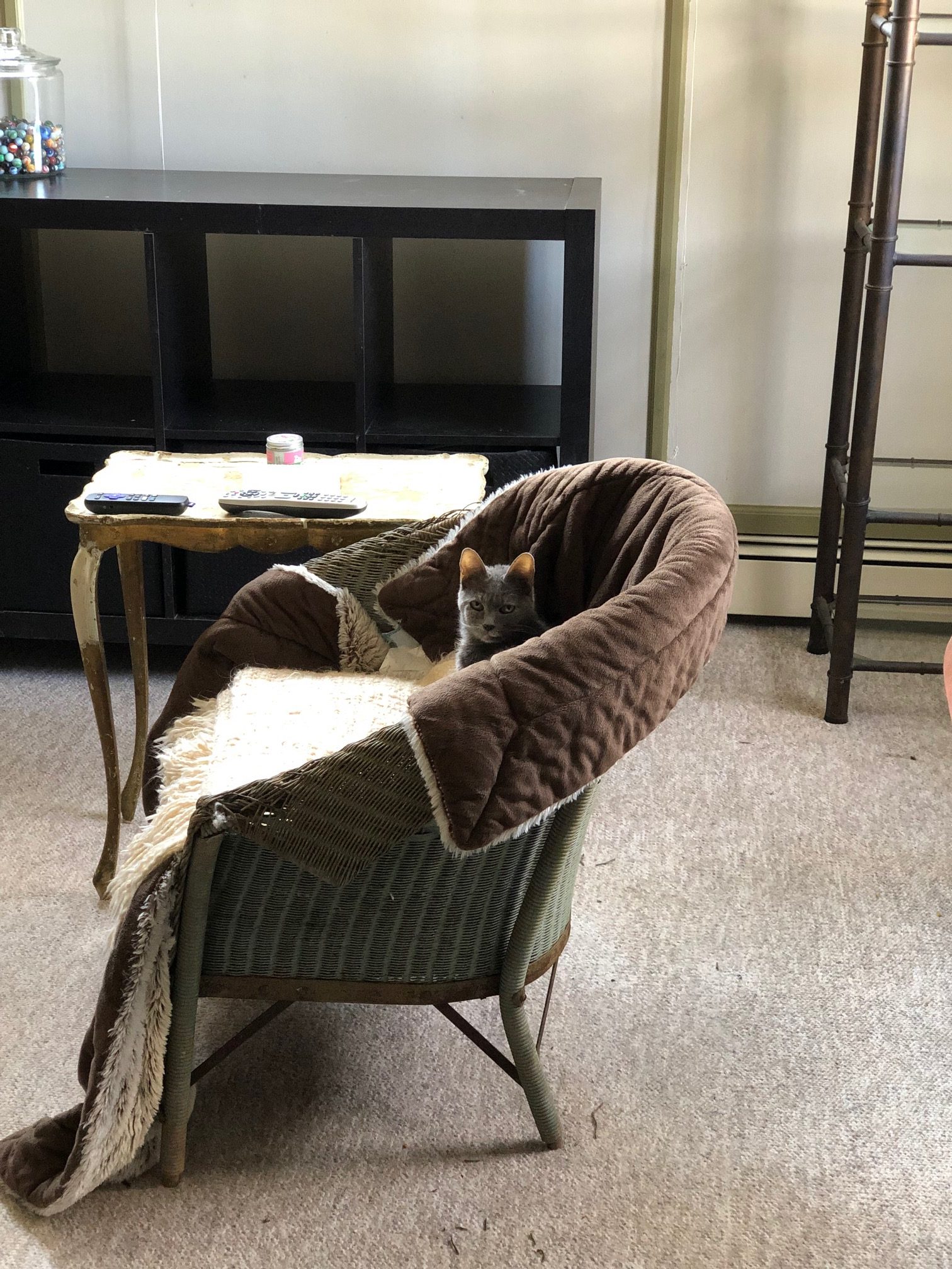 She’s also destroying that chair. See all the little rattan twigs on the floor around it??