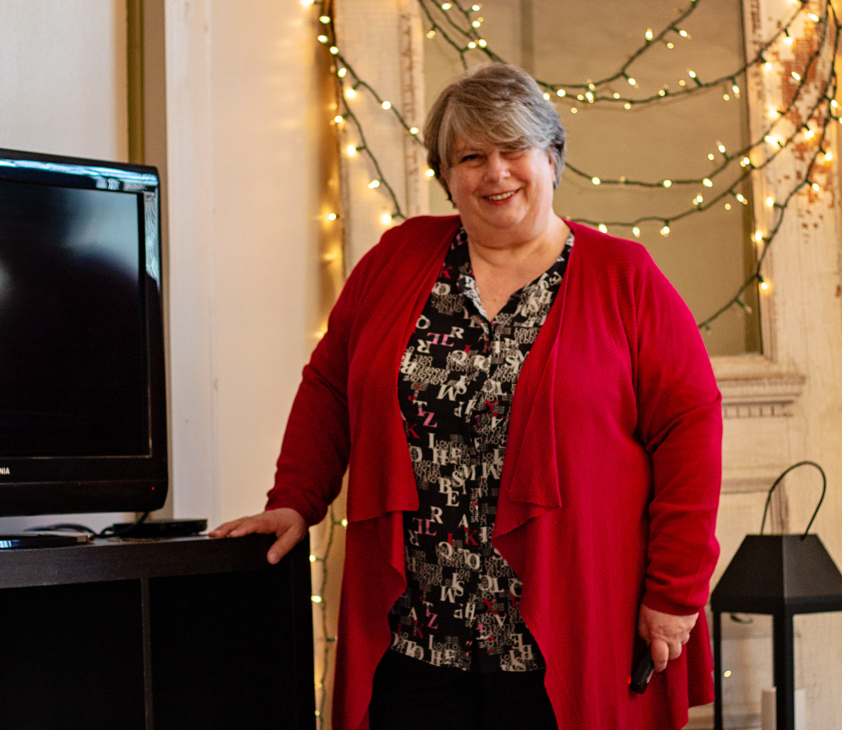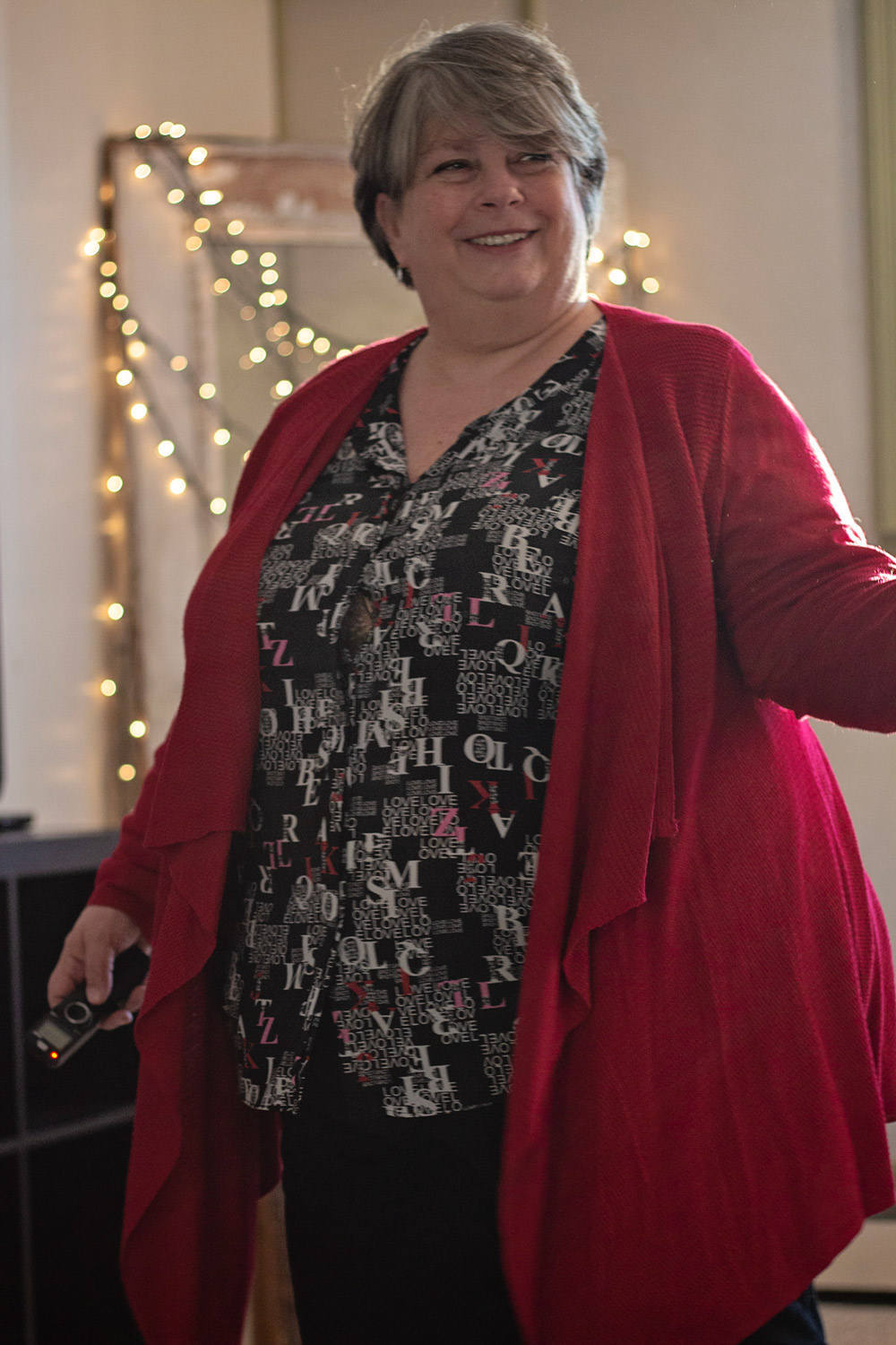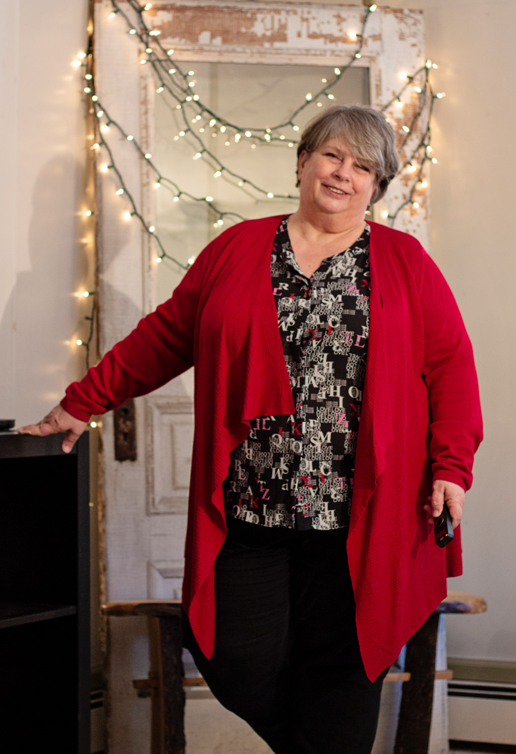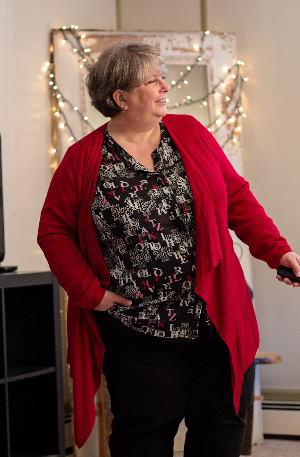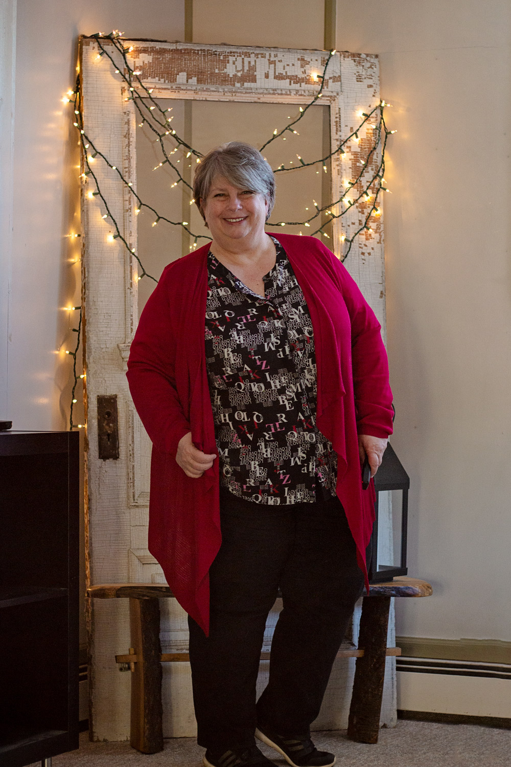 On a more positive note, how fun is this alphabet letter blouse! I’ve had this in my Gwynnie Bee closet for a couple months and I was excited to finally get it! I think the all-over graphic print is adorable and I love the use of clashing red and pink letters. So I paired it with my red cardigan from Torrid, which you saw recently here.