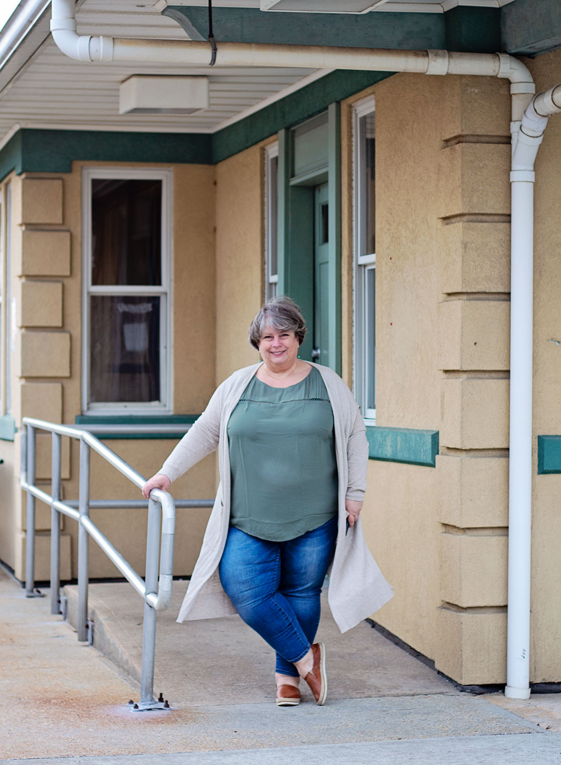 Today I wore this outfit that was inspired (ha ha, no, this was really copied!) by Maddy Gutierrez in February’s Month in Review post. I really loved the combination of the light sage green under the cream cardigan…and I already had an almost identical cardi, so it was just a matter of finding the right top.