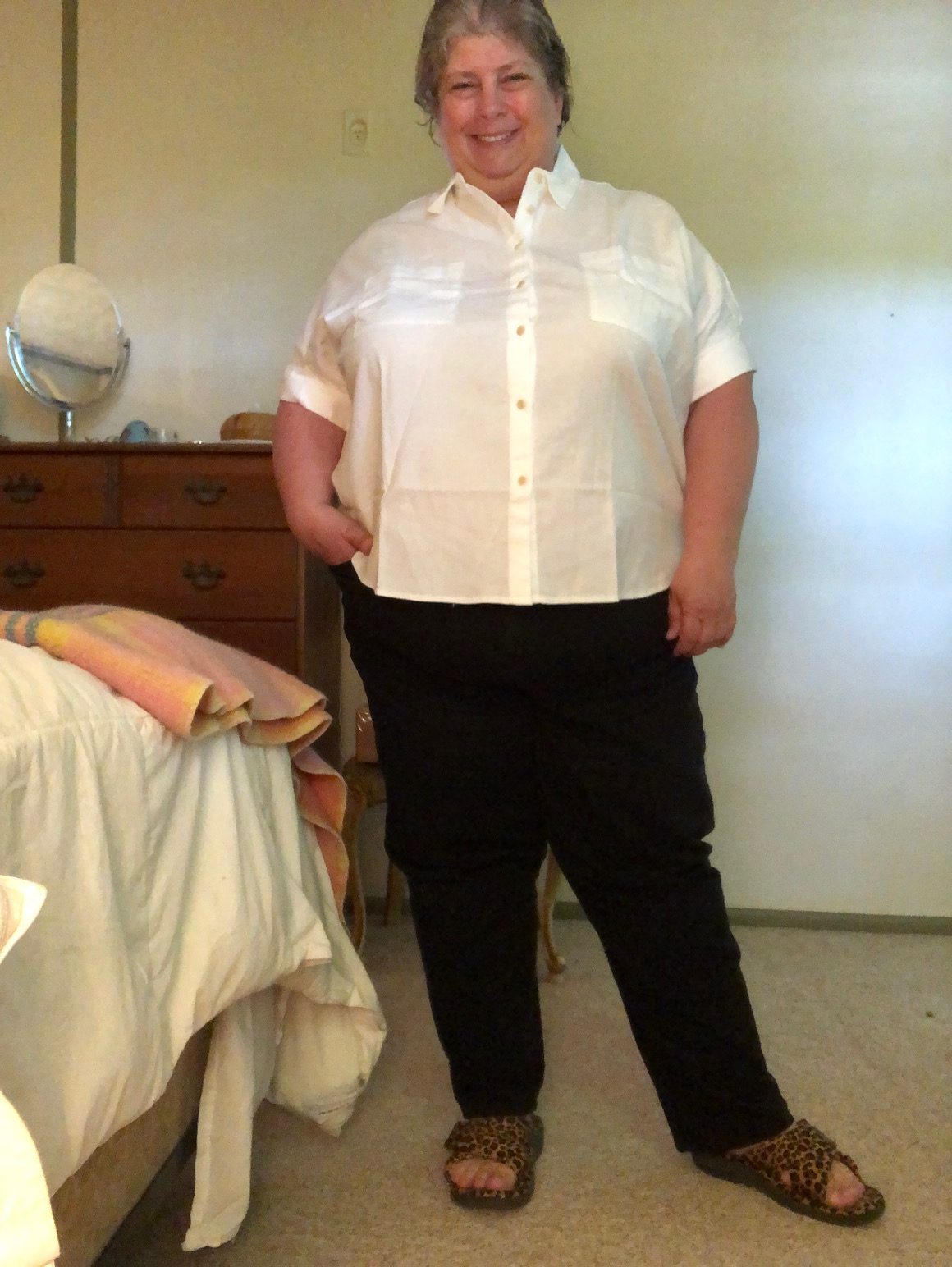 I’ve been looking for two white shirts for summer 1) a long-sleeved white linen blouse to wear open, cardigan style or tied at the waist over dresses instead of cardigans, and 2) a short-sleeved white tee – linen or cotton as a nicer alternative to a tee shirt. I always used to have a white linen camp shirt (collared, short sleeve, button-down) every summer and wore them like crazy…but I’m having a tough time finding Just the Right One this year. I bought this one from Madewell but…it’s just not quite right on me. Too short for one thing, and not enough structure at the shoulders. I kind of look like a man in this picture in the boxy shirt with my shower-wet hair combed back. The low camera angle doesn’t help! Anyway, it’s going back. Ugh. Buy return buy return.