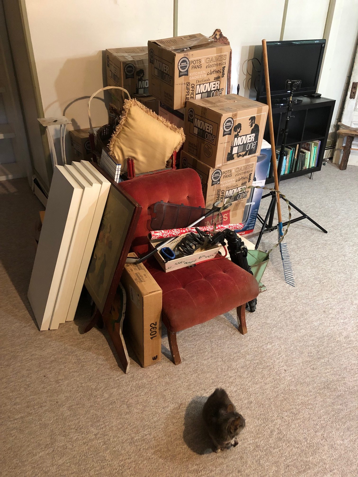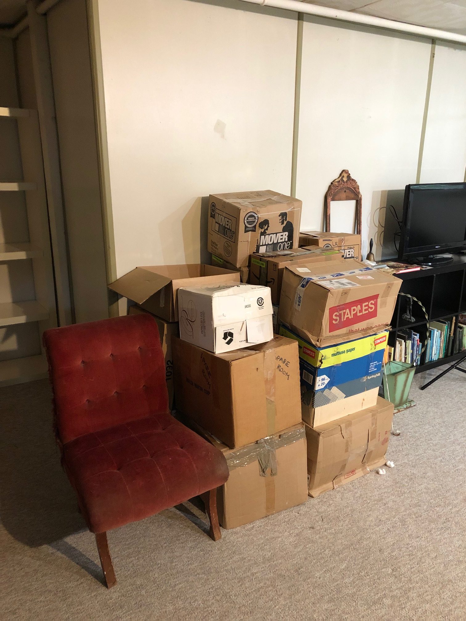 - Darling Chris from Task Rabbit came to assemble my bookcases. A fail on so many levels. He was fine, kept trying different things, but no matter what, as soon as one of the bookcases was assembled and we went to move it to its spot, it went down like dominos. It was crazy. After an hour we made the decision to quit for the day, and I would decide how I wanted to proceed (use extra hardware, perhaps…or find different bookcases altogether) and then I would reach out to him again. Obviously, I paid him for his time so now I was out $$ and STILL had no bookcases. PLUS, once one was assembled oh so carefully on the spot and we braced it up against the wall with the pieces of the other bookcase before it could fall apart, I could see that two were not going to fit, after all! When I first moved in and decided I wanted these two bookcases against the back wall of the alcove, there were boxes all along the side wall, so I had to measure wall-to-wall above the boxes. Turns out there’s a weird 2.5″ lip (like a weird molding) along the bottom of the wall, it comes up close to 10″… and those 2.5″ are preventing both bookcases from fitting in the space side by side and looking like a built-in library wall. So disappointed. Since then I’ve decided I do not want to spend the money to buy two new (and I mean “new to me,” like off CraigsList, not NEW) bookcases…and I go back and forth between thinking we’ll just use a bunch of metal L brackets to brace this thing together and I’ll put in the middle of the alcove wall and call it a day…OR not even bother with that extra expense and just push the boxes into the alcove and work out of them one at a time. That was a really long, boring, dumb story. But this is where we’re at: