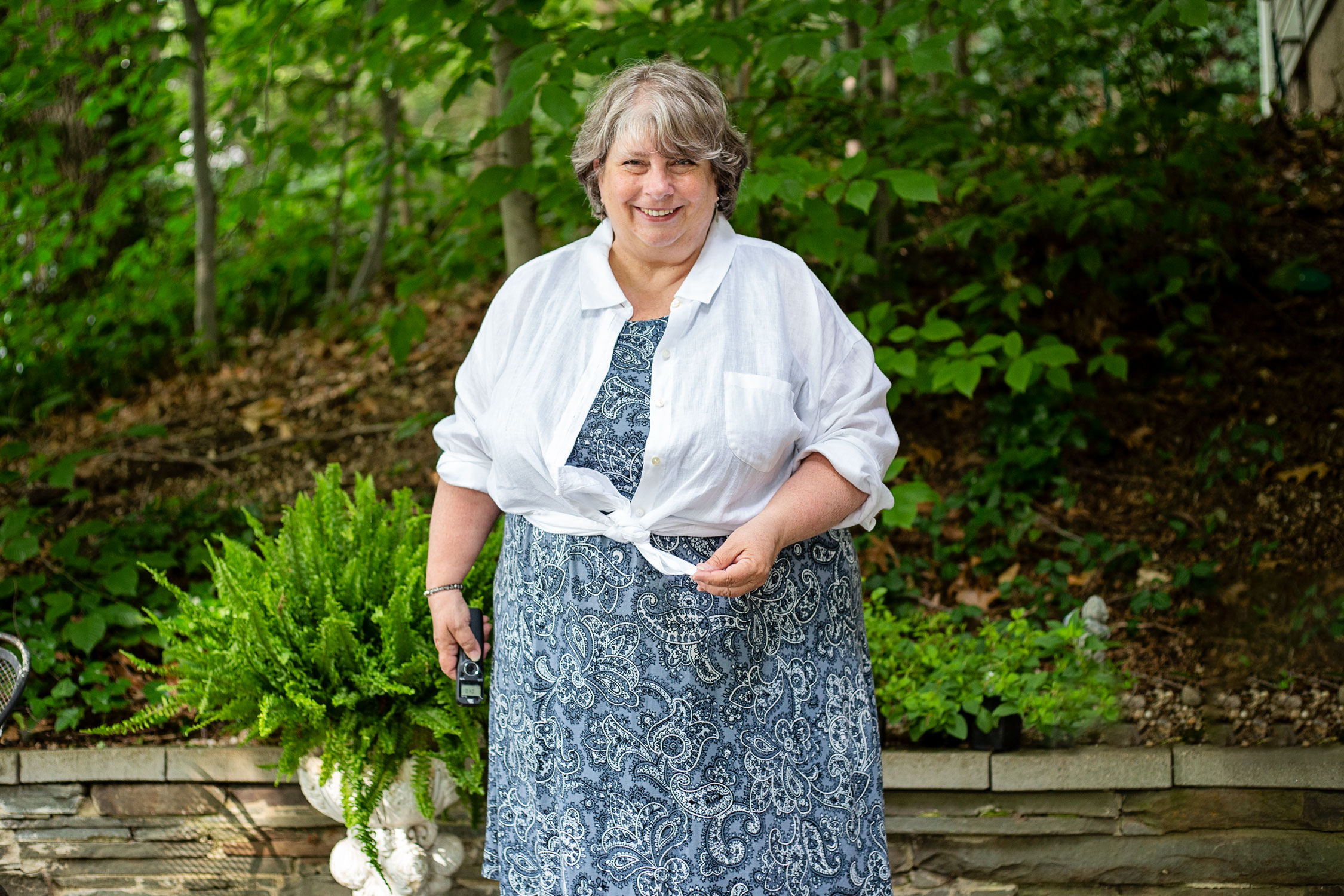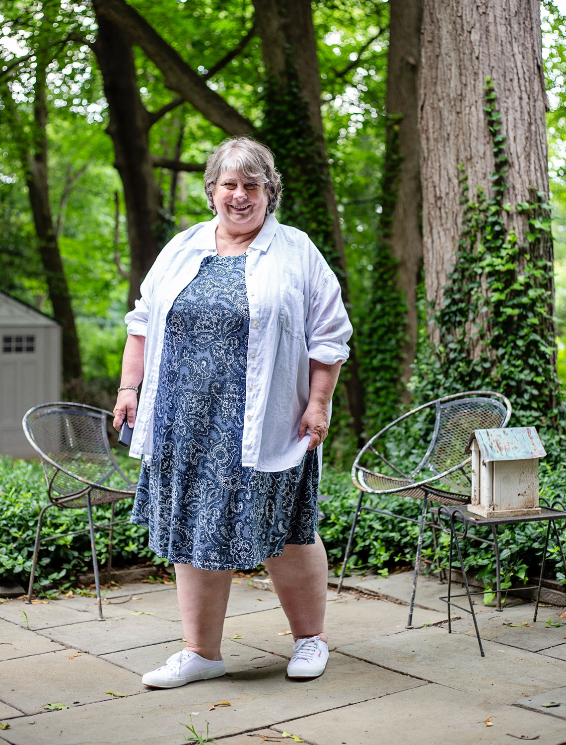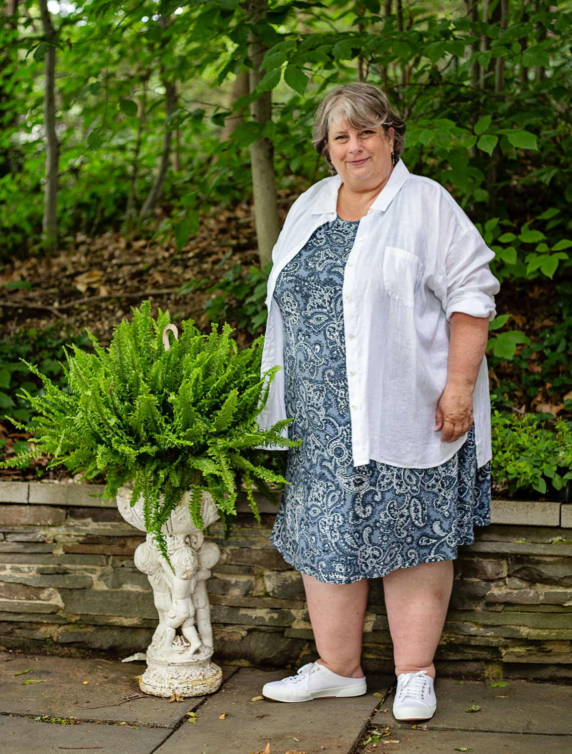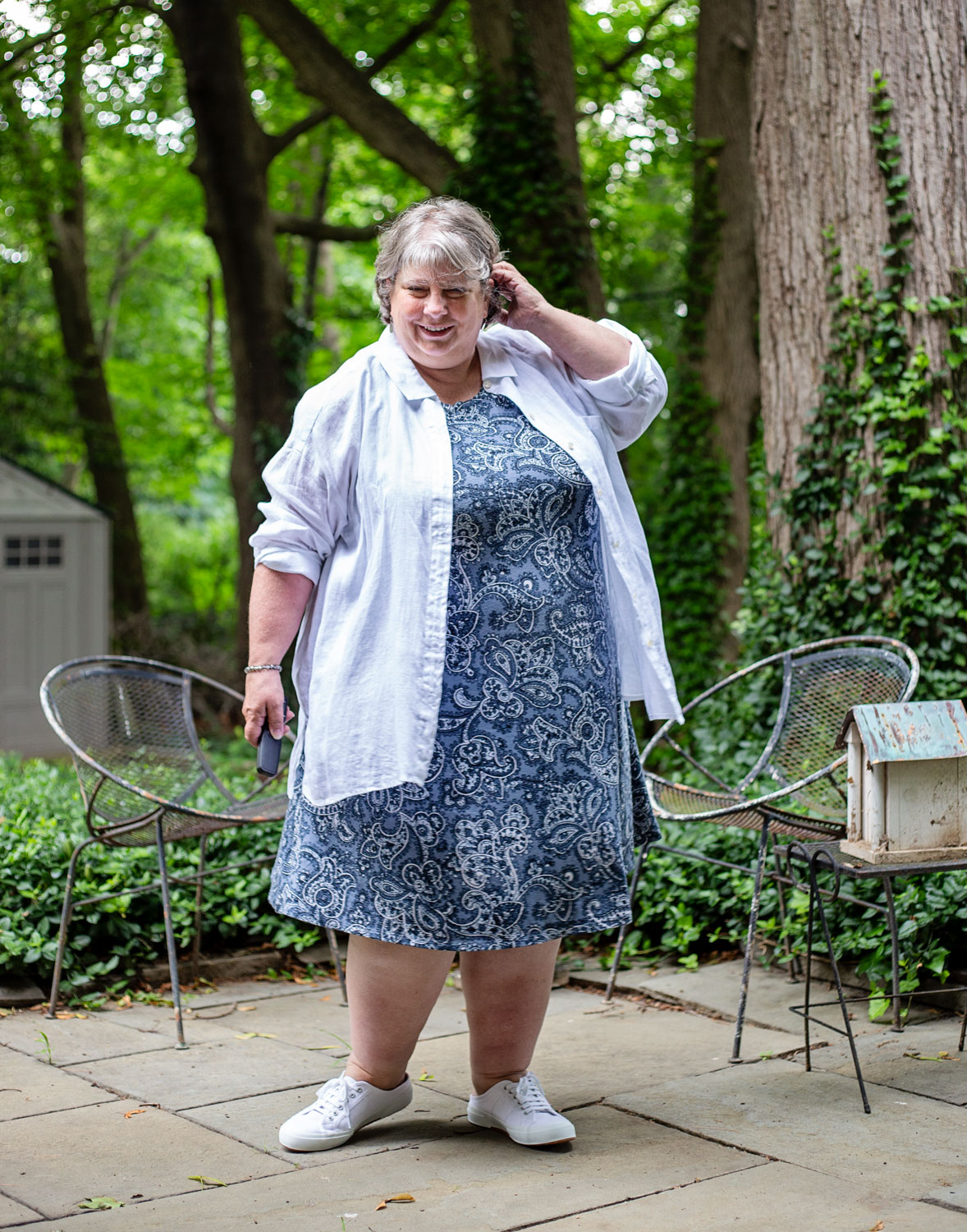 Today’s outfit comprises all three “must-haves.” I love loose-fitting, swingy dresses…and I love linen in summer, even in its most crumpled, wrinkly state. I’m most comfortable in loose clothing and sneakers. And I feel good in all three of these pieces.
