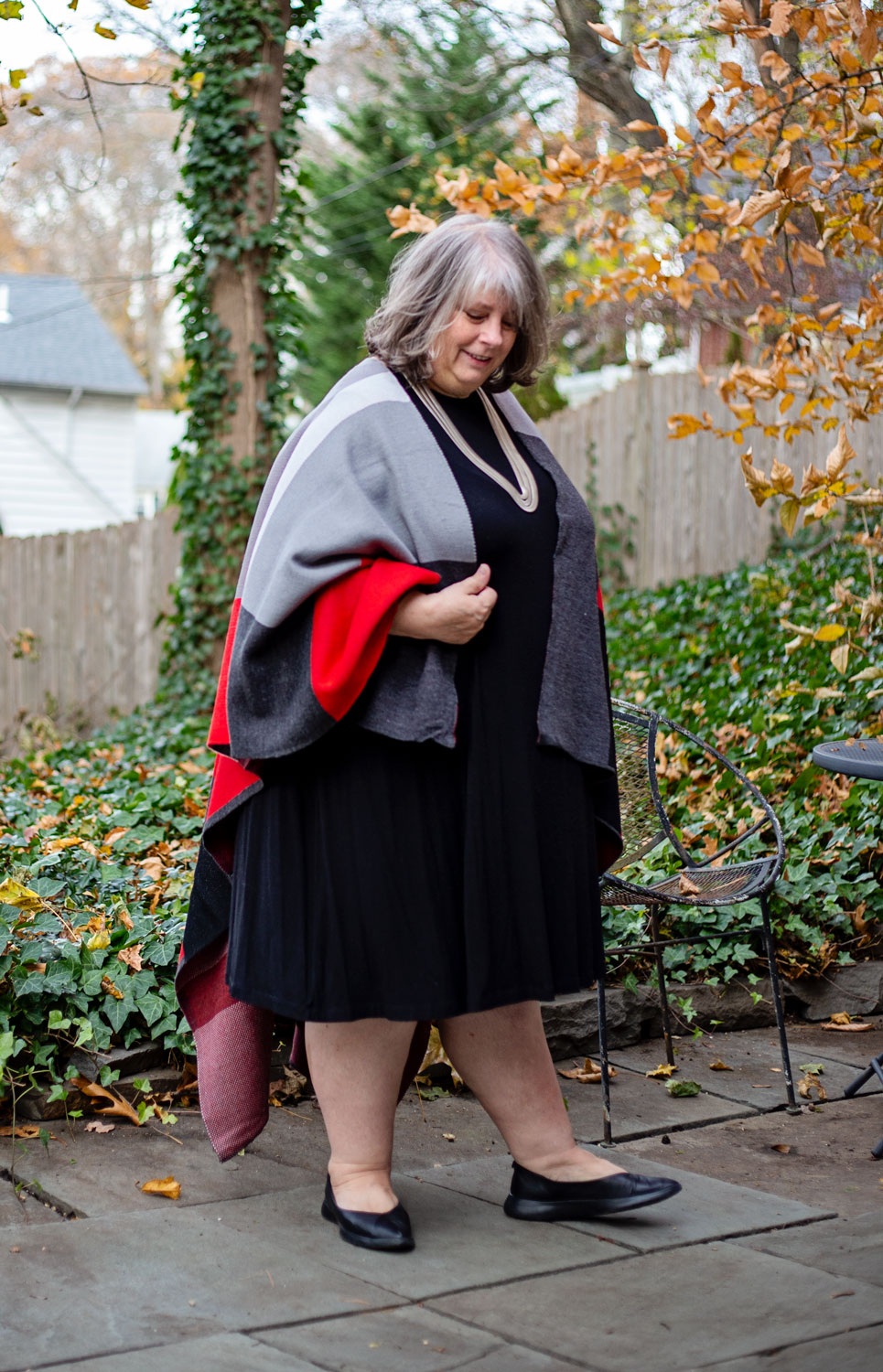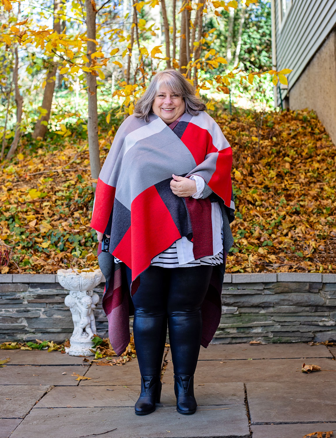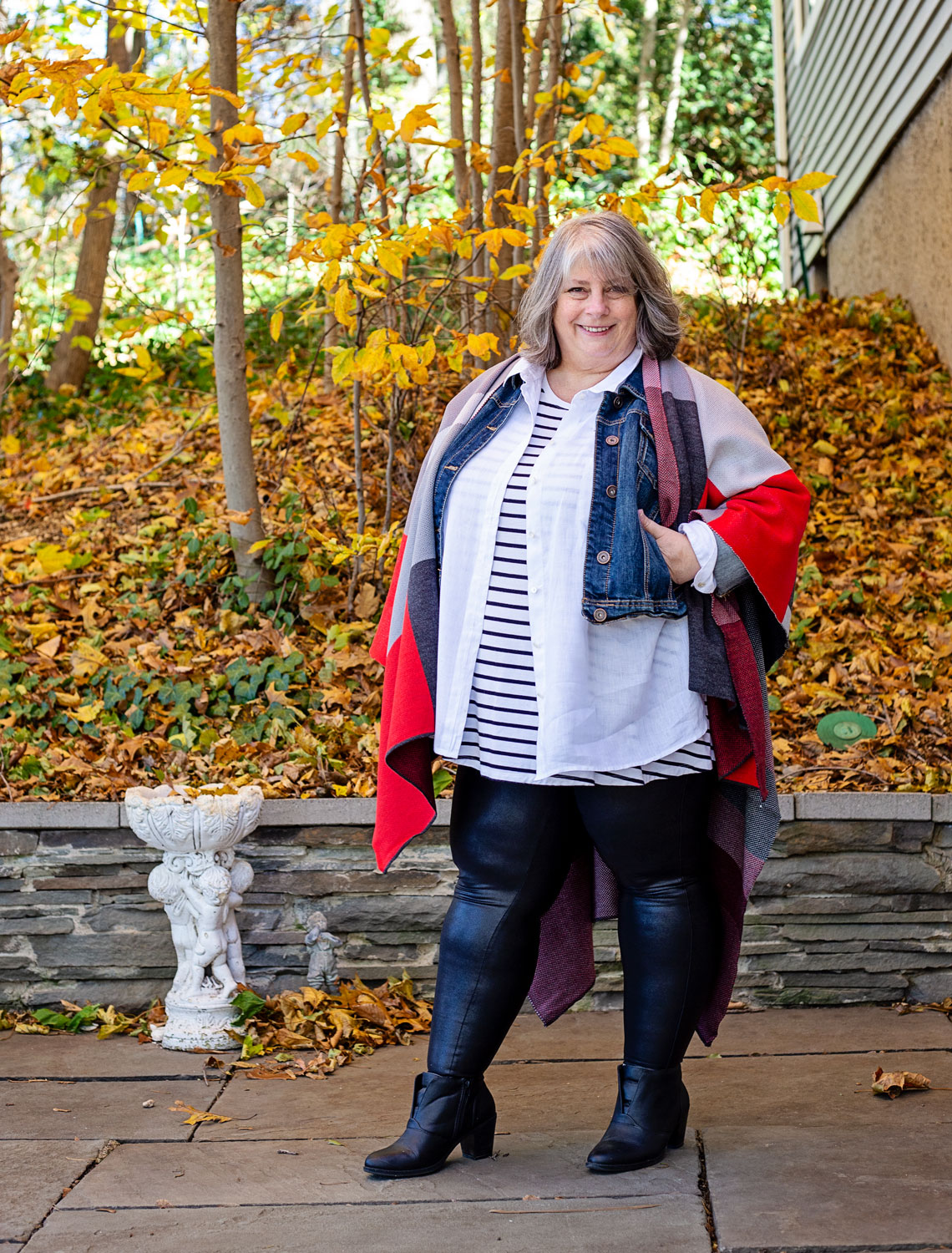 Here I’m wearing my black faux leather Spanx, striped tee, white linen blouse AND cropped denim jacket AND black booties with the red, black and grey Ruana over top. Does this qualify as the most layering pieces EVER??
