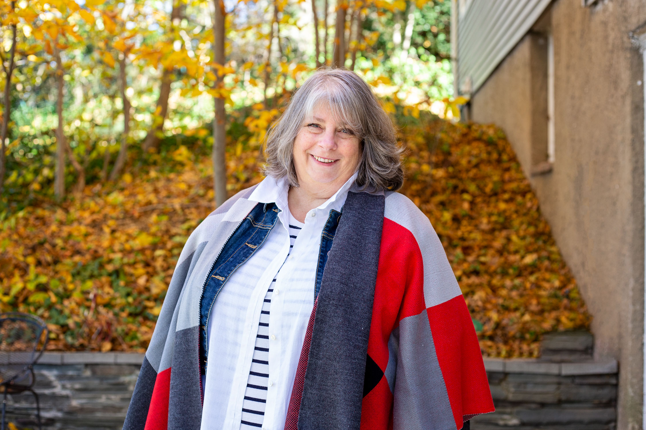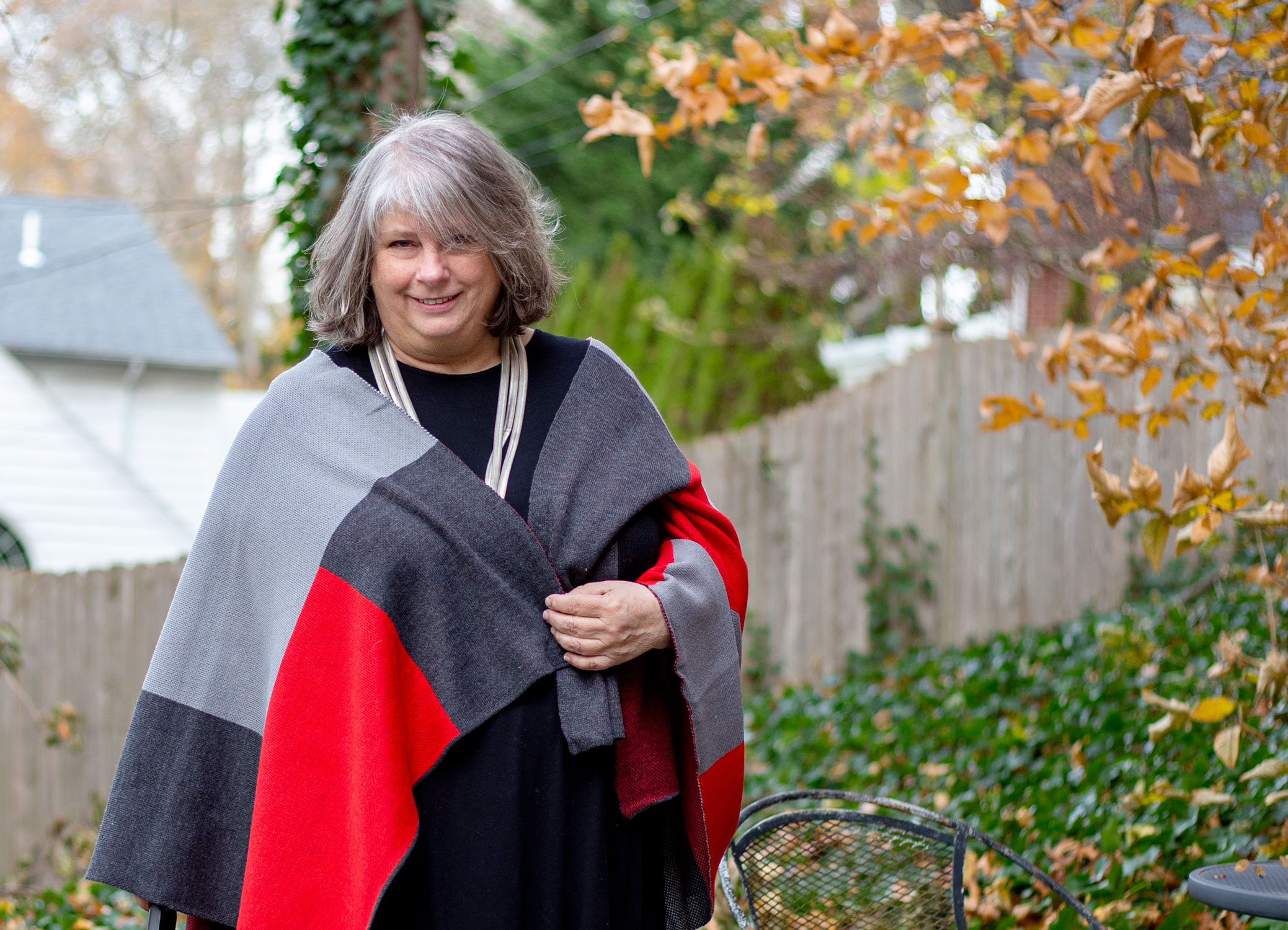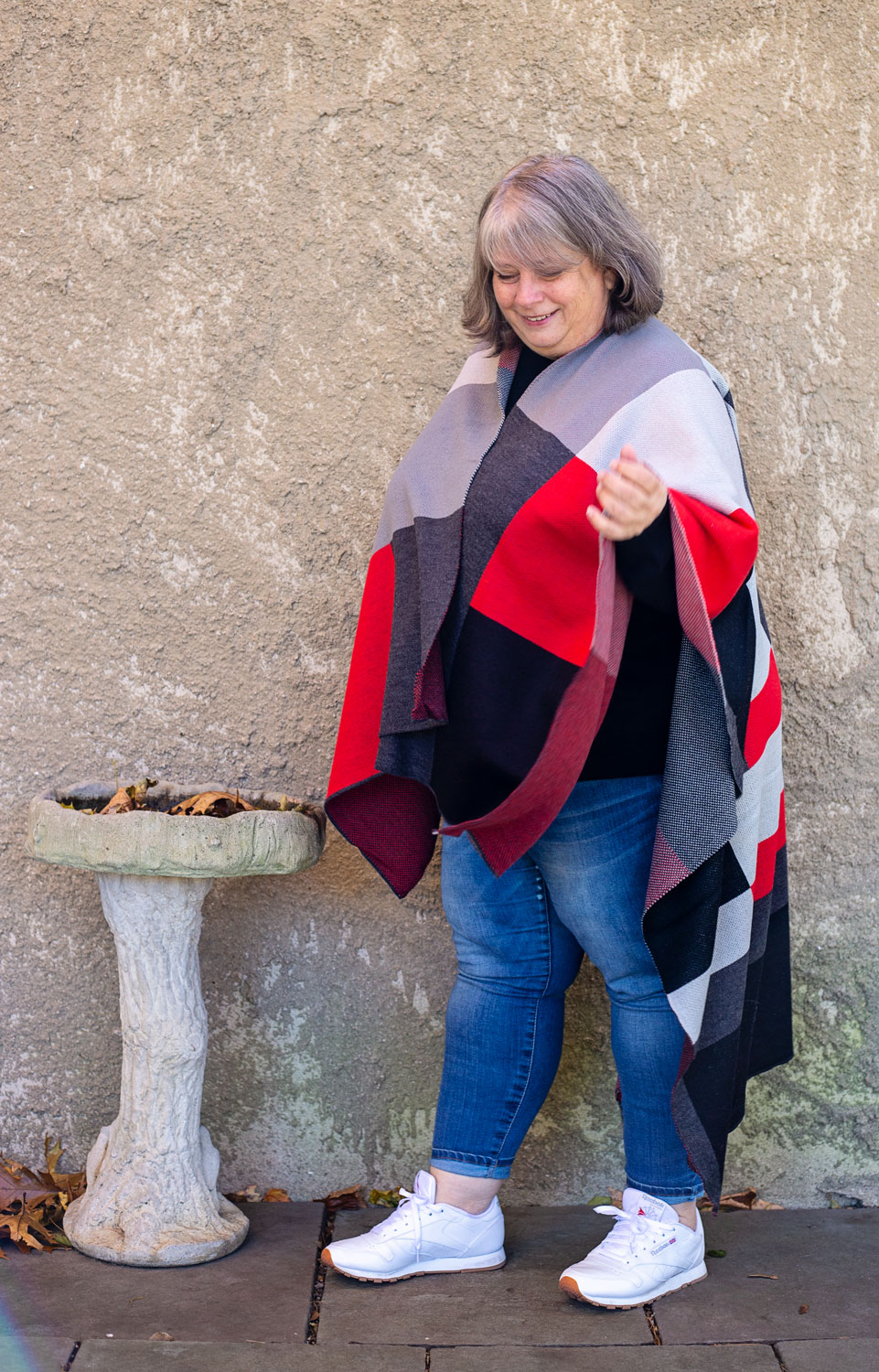 Here I’m wearing my black faux leather Spanx, striped tee, white linen blouse AND cropped denim jacket AND black booties with the red, black and grey Ruana over top. Does this qualify as the most layering pieces EVER??