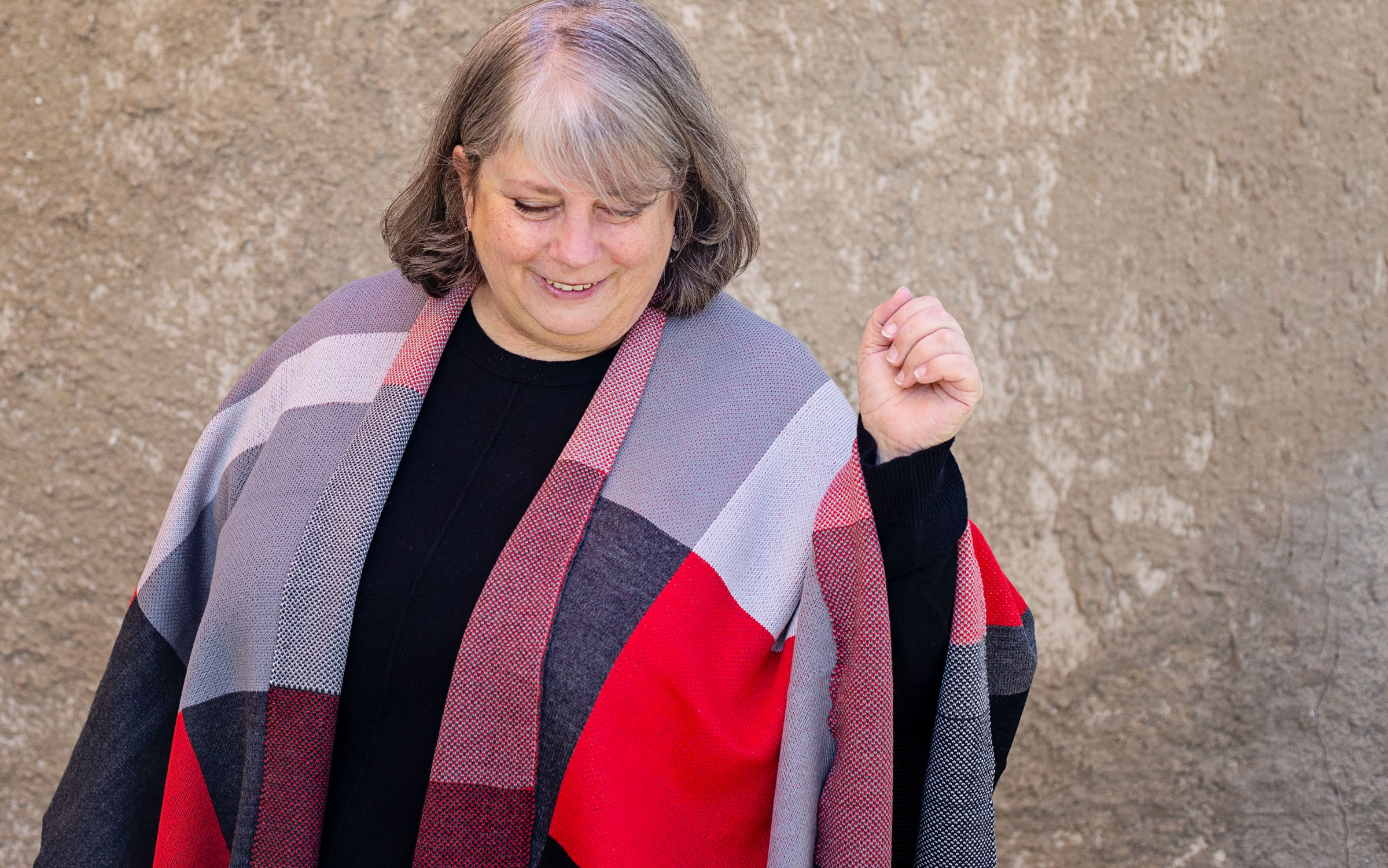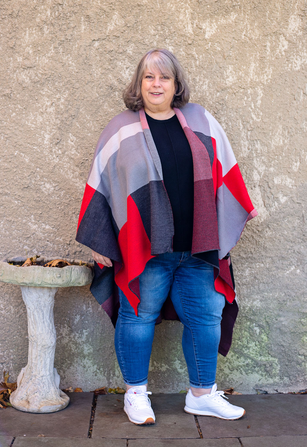 What the heck is a Ruana, anyway? A Ruana is a poncho-style wrap – it’s heavier than a traditional wrap and has seaming like a poncho. Kind of like a blanket that your head and arms go through. They’re easy to throw over an outfit on cool days, less structured than a coat and much cozier!