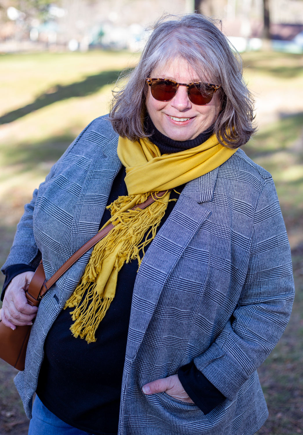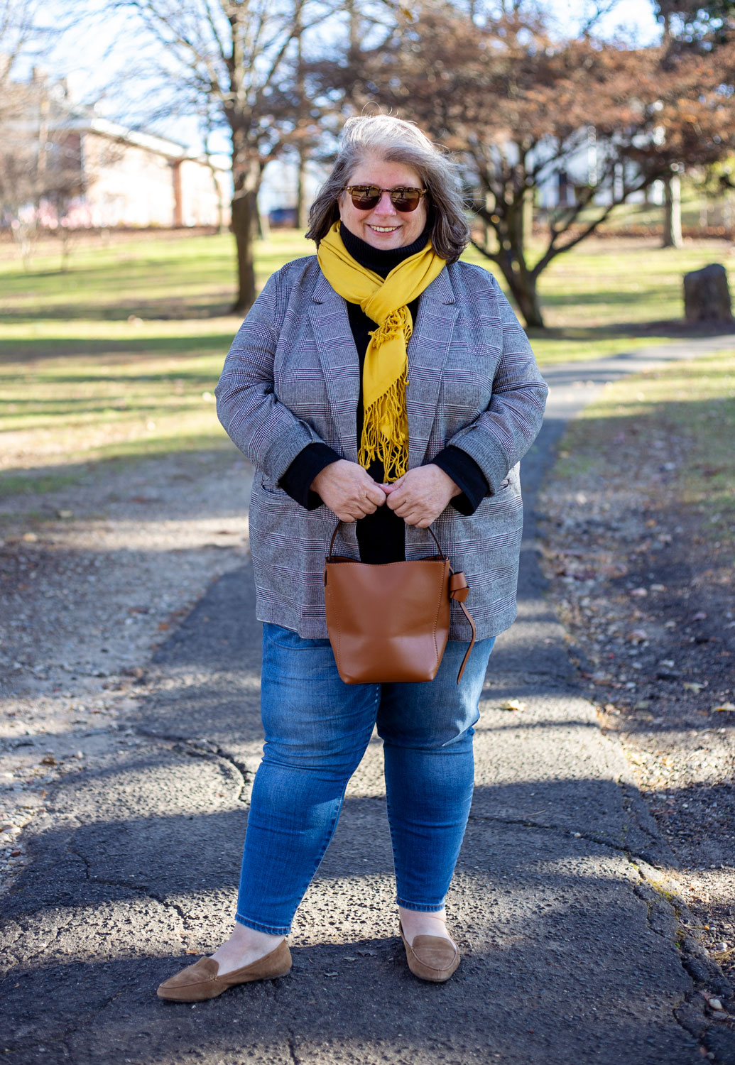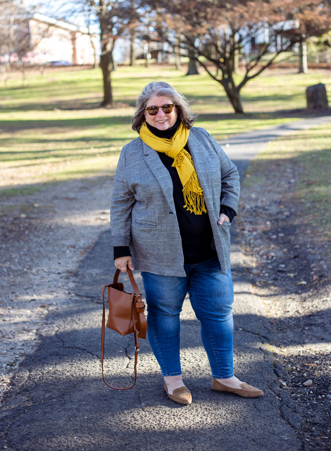 This black plaid blazer you’ve seen before here. I’ve been wearing it as a jacket sometimes when the weather is right (not too warm, not too cold). Black turtleneck to keep me warm. I’m very into black as a base layer lately. Cropped skinny jeans – that are starting to show signs of the inner seam wearing out OH NO. So I’m on the hunt for a new skinny jean. And my golden yellow scarf from TJ Maxx ages ago. A cheapy but a favorite, it brightens up even the most drab outfits. And the cognac bag that has turned out not to be the bag of my dreams, so I’m the hunt again for that and I’ll resell this one on Poshmark.