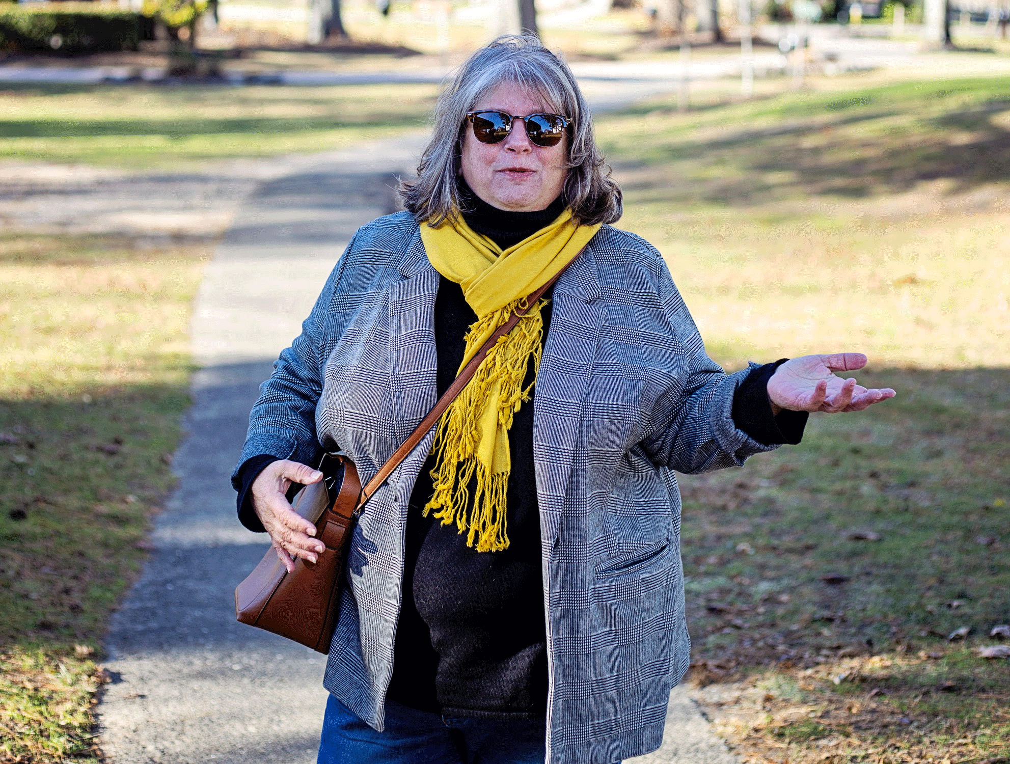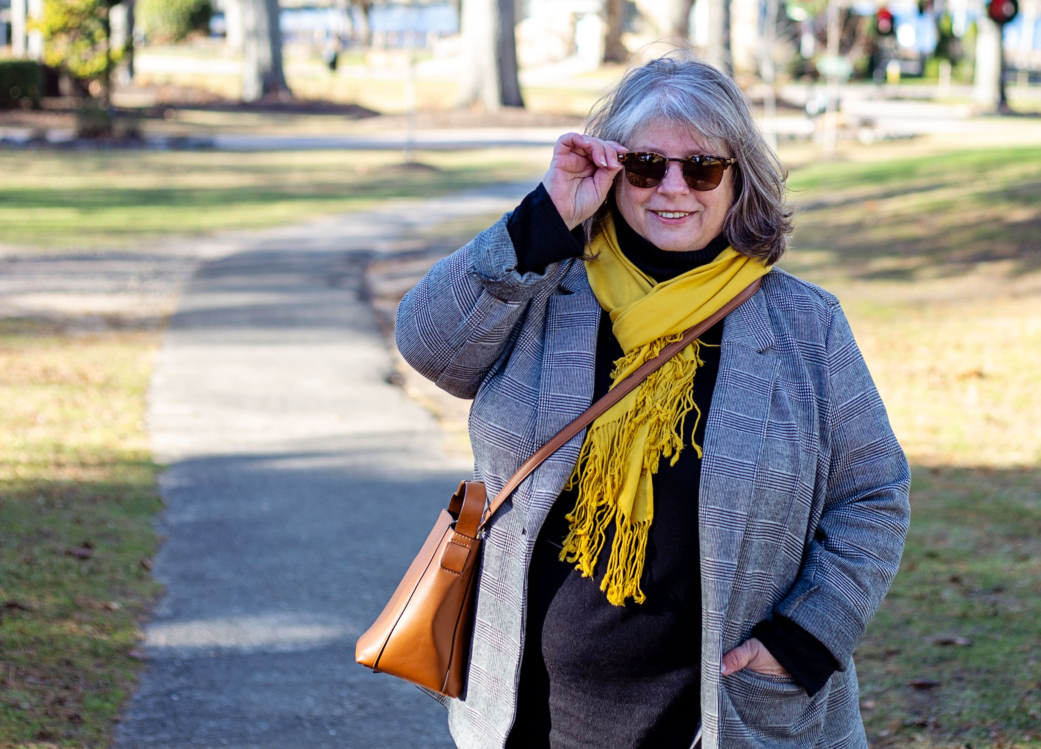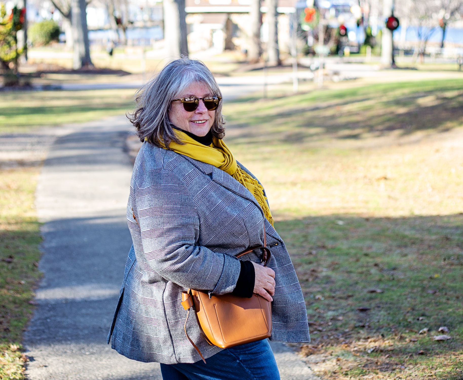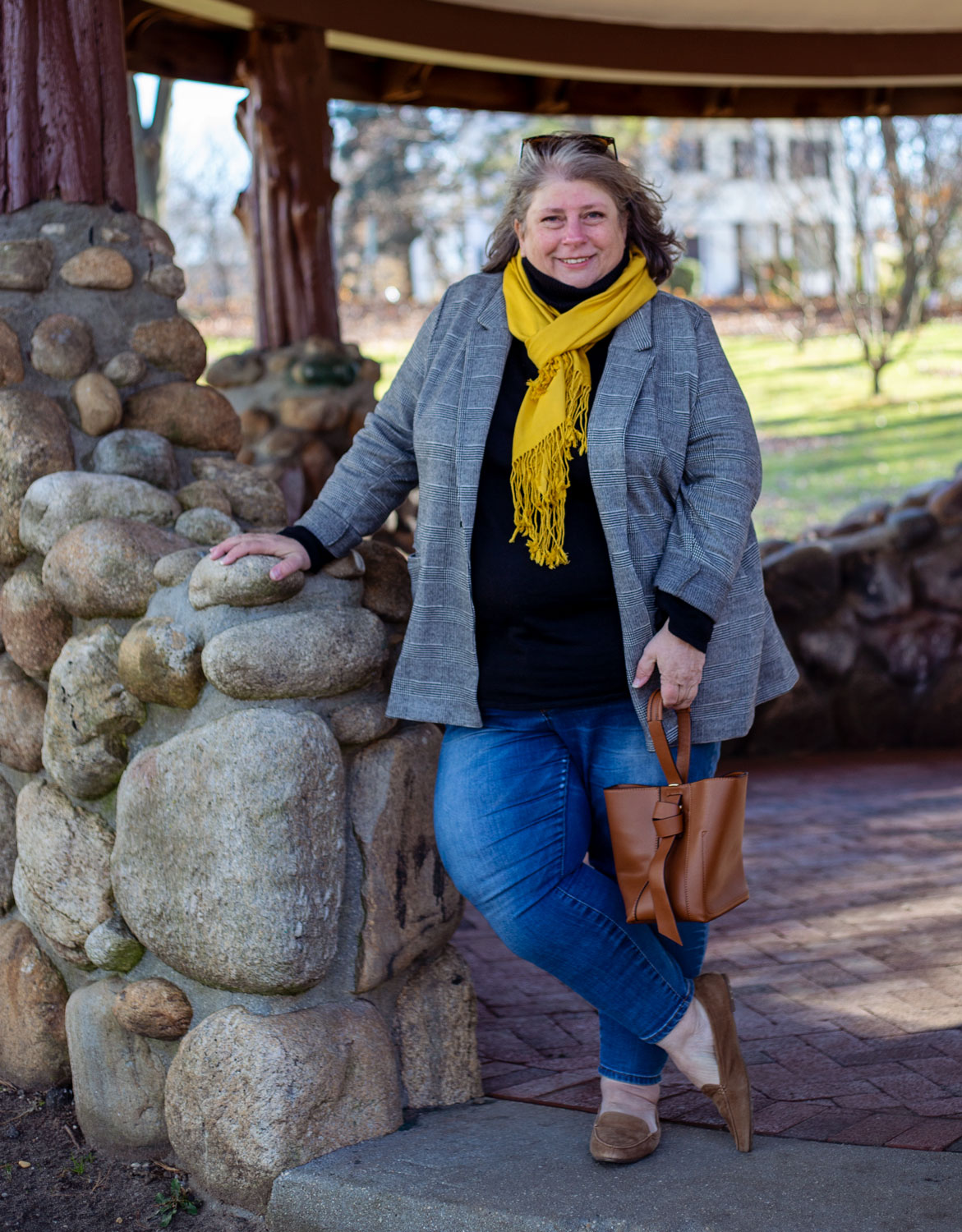 This black plaid blazer you’ve seen before here. I’ve been wearing it as a jacket sometimes when the weather is right (not too warm, not too cold). Black turtleneck to keep me warm. I’m very into black as a base layer lately. Cropped skinny jeans – that are starting to show signs of the inner seam wearing out OH NO. So I’m on the hunt for a new skinny jean. And my golden yellow scarf from TJ Maxx ages ago. A cheapy but a favorite, it brightens up even the most drab outfits. And the cognac bag that has turned out not to be the bag of my dreams, so I’m the hunt again for that and I’ll resell this one on Poshmark.