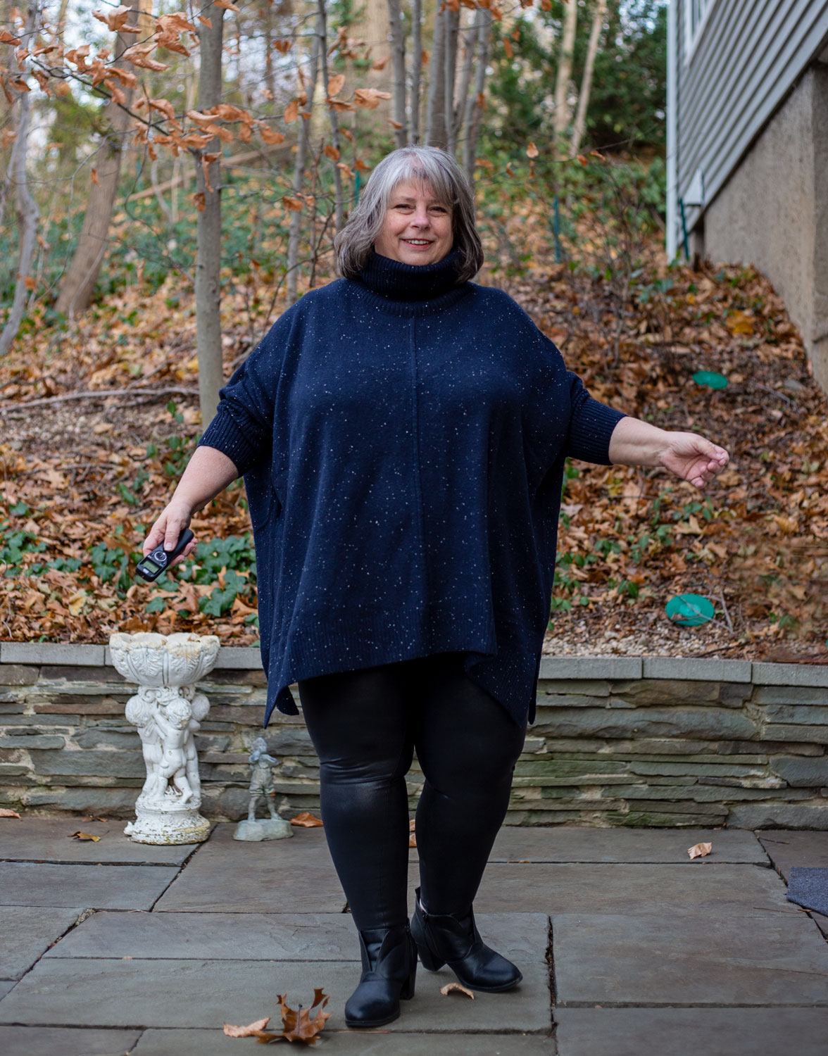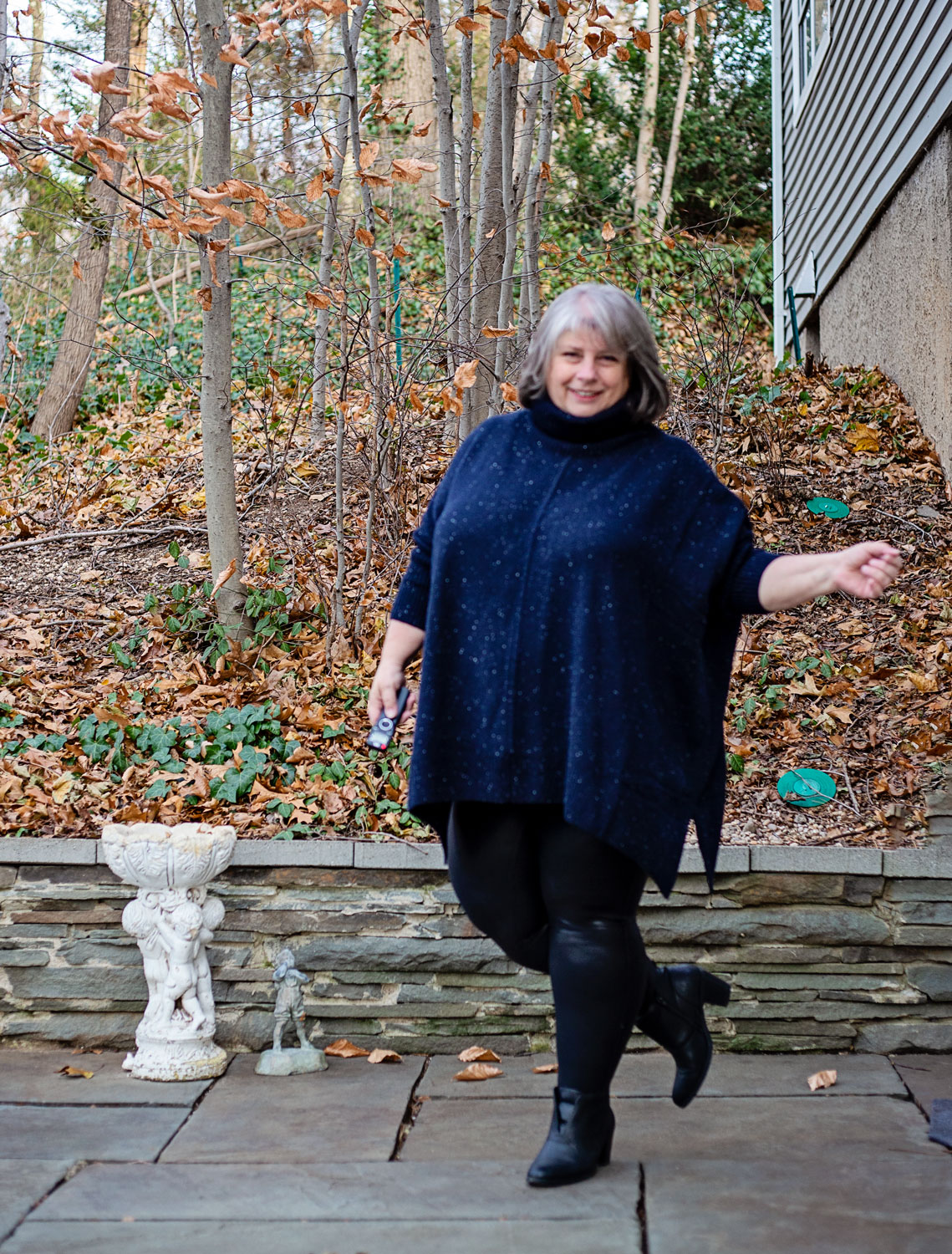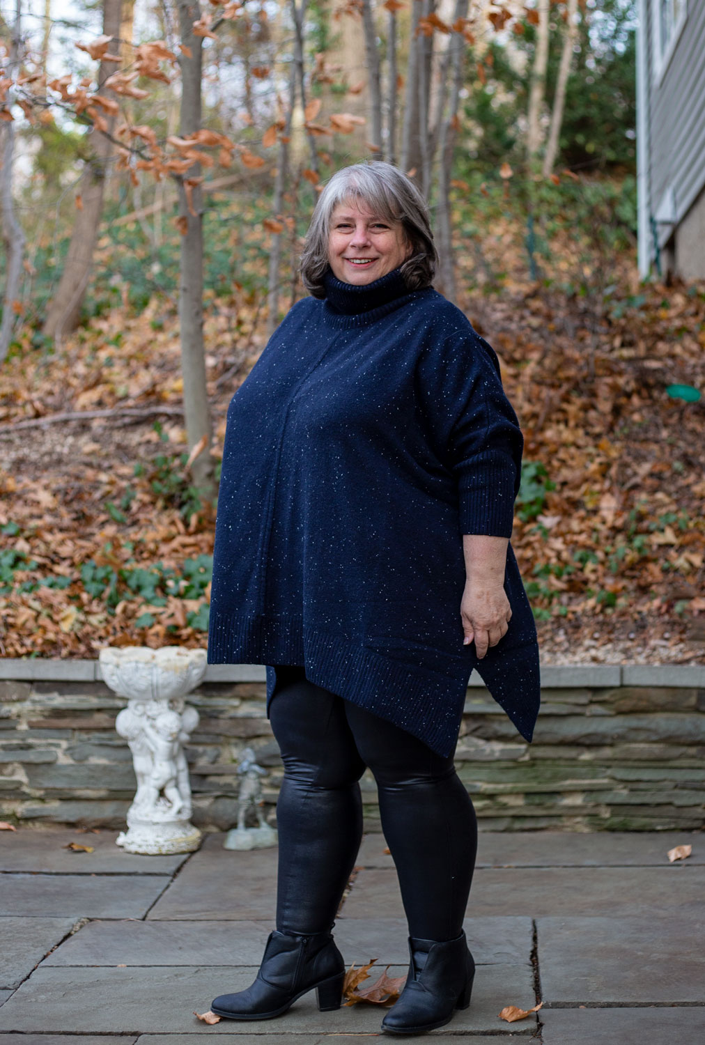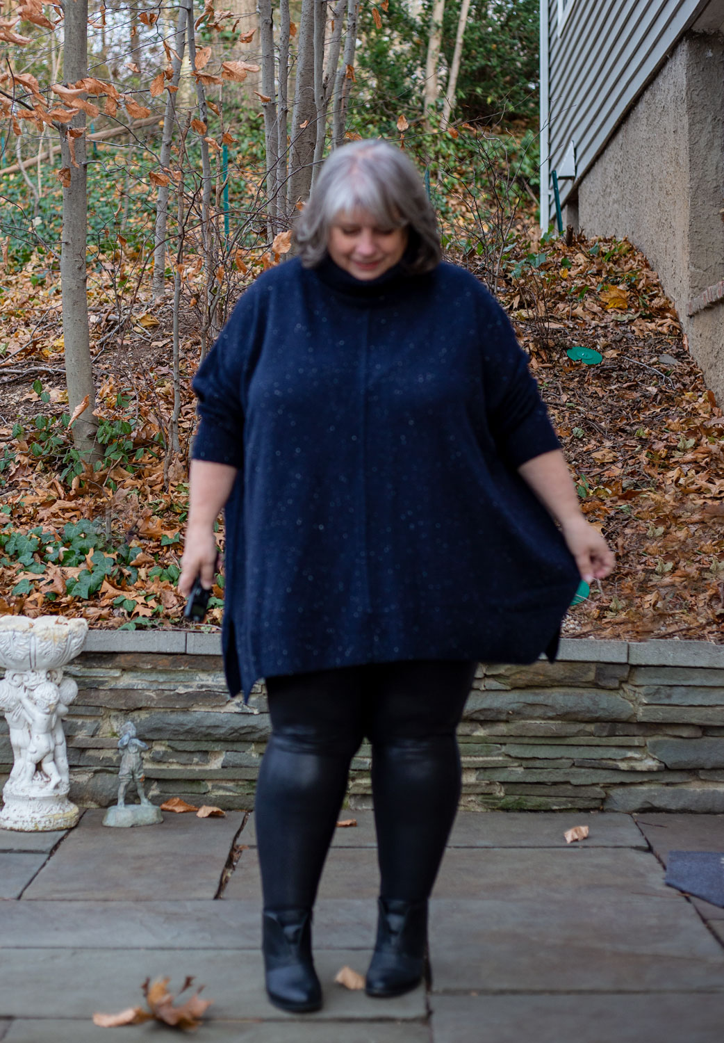 BUT. I own them. They fit me. They FEEL good. I LOVE the way they look with this navy poncho turtleneck. So. I need to wear them.