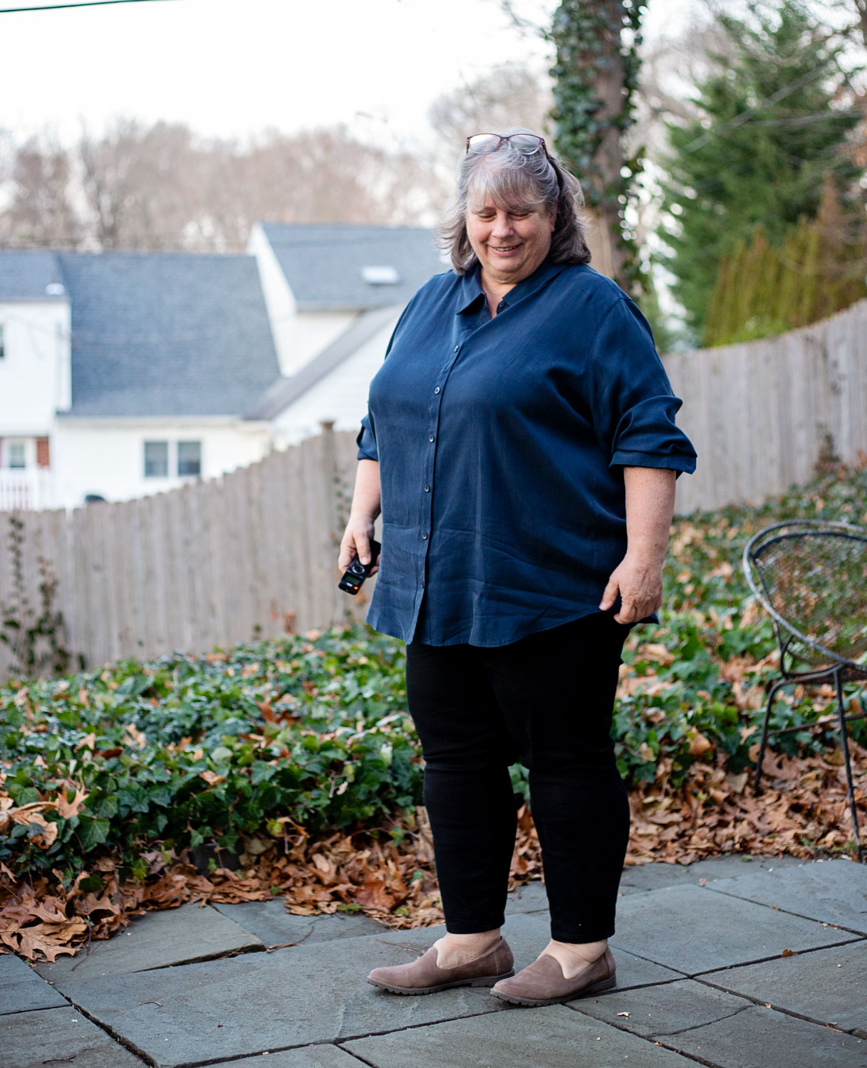 - Navy Kennedy Cupro blouse from Universal Standard, size XL (US sizing is not standard sizing). This is my introduction to Cupro* fabric and I’m in LOVE. It feels like a heavy, sueded, washed silk. So lovely. And it’s a sustainable fabric. This is also a rental from nuuly.com.