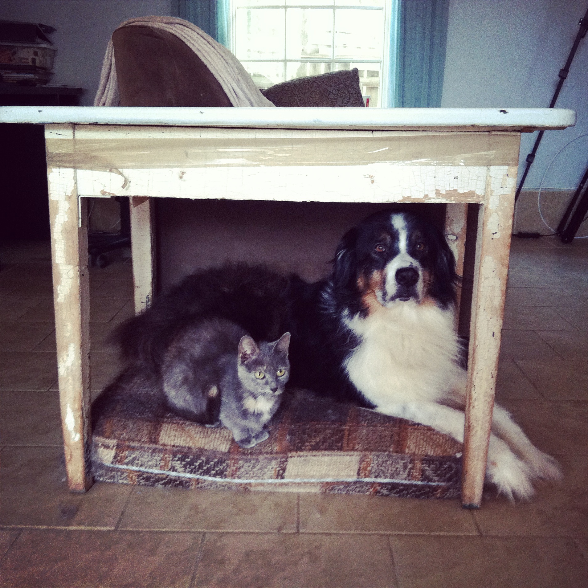 And yes, Janey’s love for Caleb was strong and true. If he was on the sofa, she was on the sofa; if he was looking out the window, she was looking out the window; if he made a dog fort on the floor, she was IN the dog fort 🙂 I miss her having an animal buddy cuz now she’s ON ME ALL THE TIME.