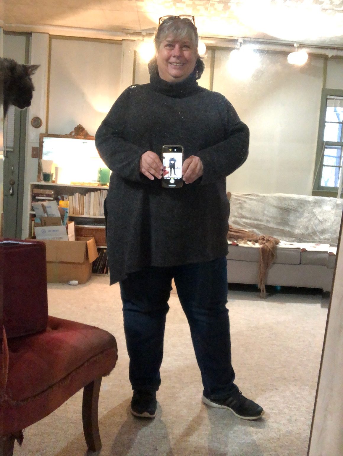 Schlubby Day Two. It’s not super cold right now, but it still feels nice to be cozy. Plus, doesn’t my head look big here? Ha ha. I have the hardest time with cellphone selfies. They’re so distorting.