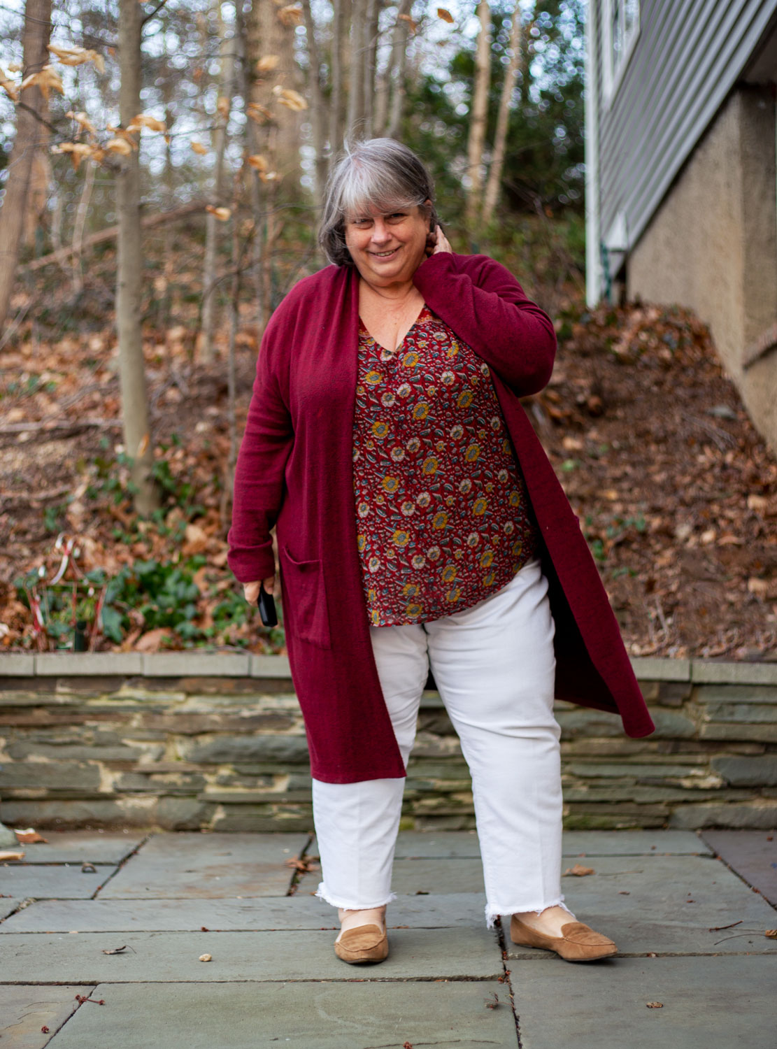 Temps were expected to go above 50 today…and the next few days will be rainy, so I wanted something a little lighter today. At this point almost all my cardigans are duster length…so I don’t wear them often in cold weather because they’re longer than all my winter coats. Not in a cute “cropped over long” way…but in an awkward “long over longer” way. So I mostly only wear them on days that I don’t need to wear a coat.