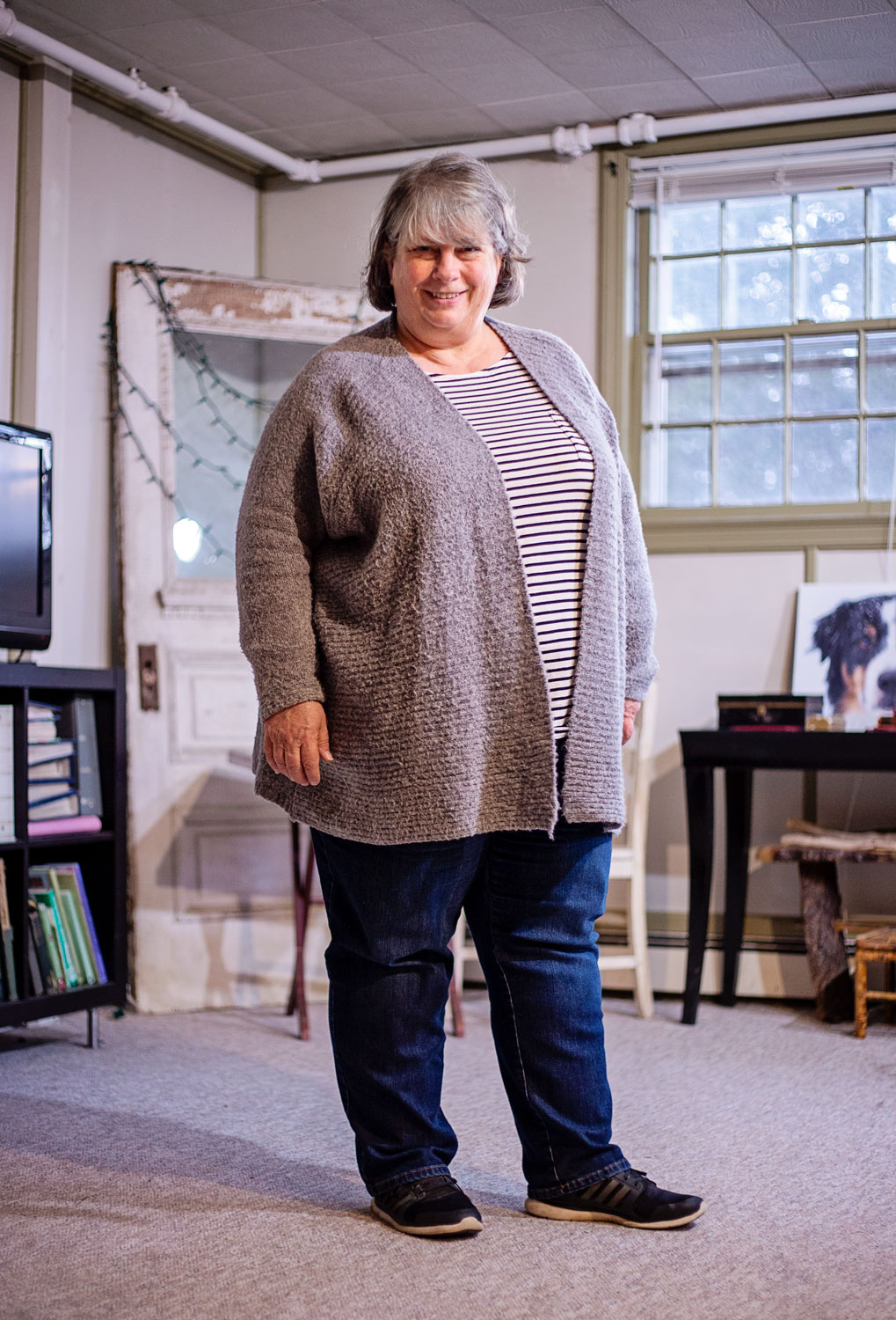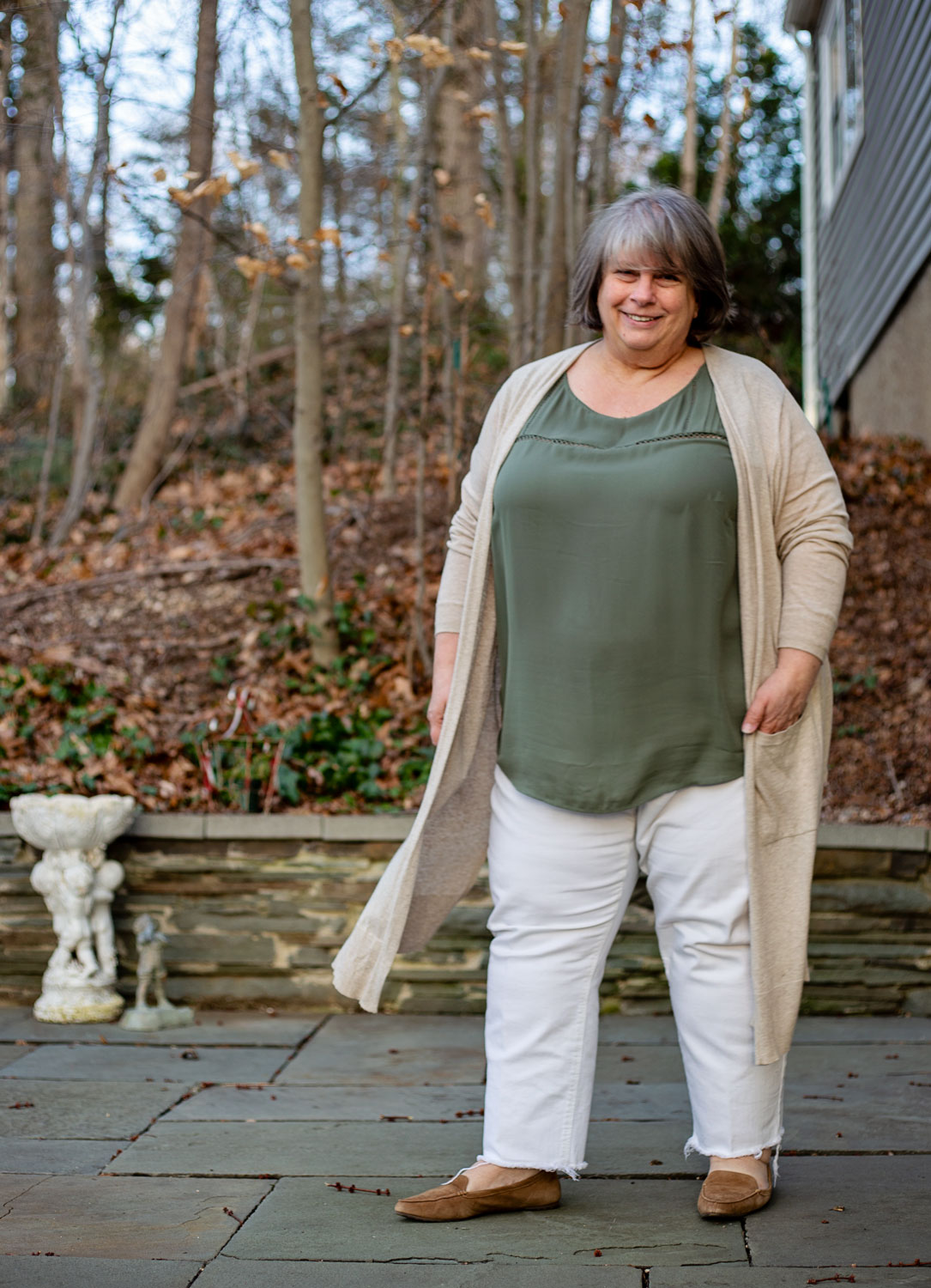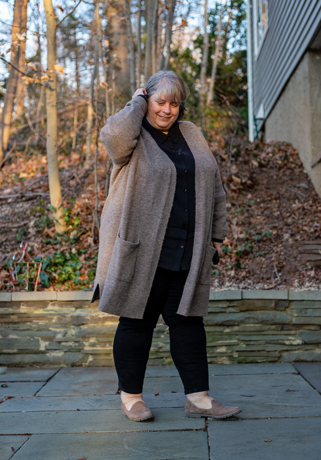 I love the black outfit (looks black on my computer) and gray cardigan – especially the cardigan. I’m in love with the long sweaters.