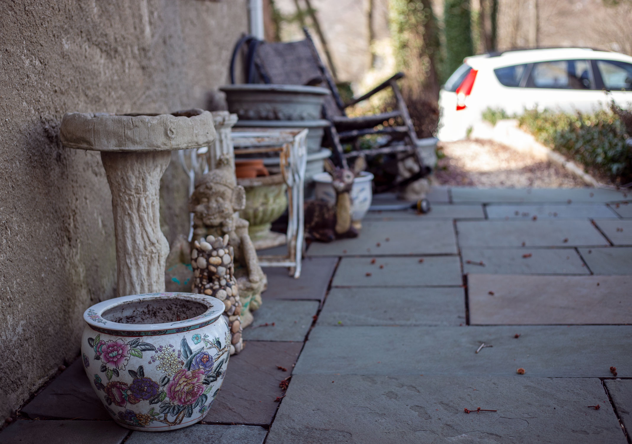 The only difference between junky front patio and decorated front patio is grouping. That and add some fairy lights, and it looks intentional…haha.