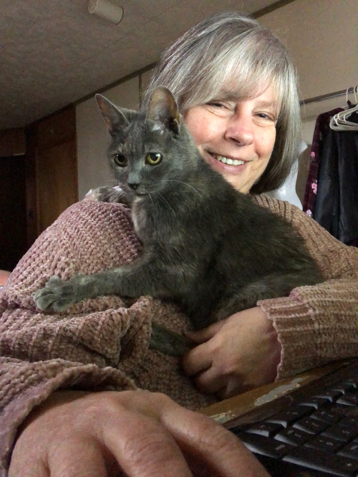 Whenever I’m not actively typing, she crawls in for a cuddle.