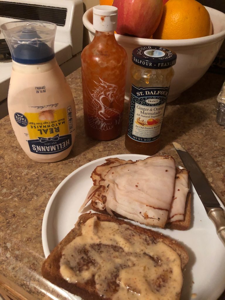 I had a sandwich. I like making my own “fancy” mayonnaise. Today, with cajun turkey, I mixed mayo, orange marmalade (typically I would use raspberry for turkey but the raspberry marmalade has disappeared), and sriracha. So it’s a little creamy, a little sweet, and a little spicy.