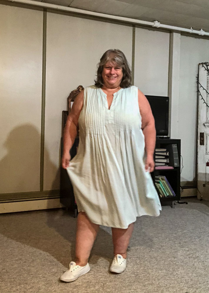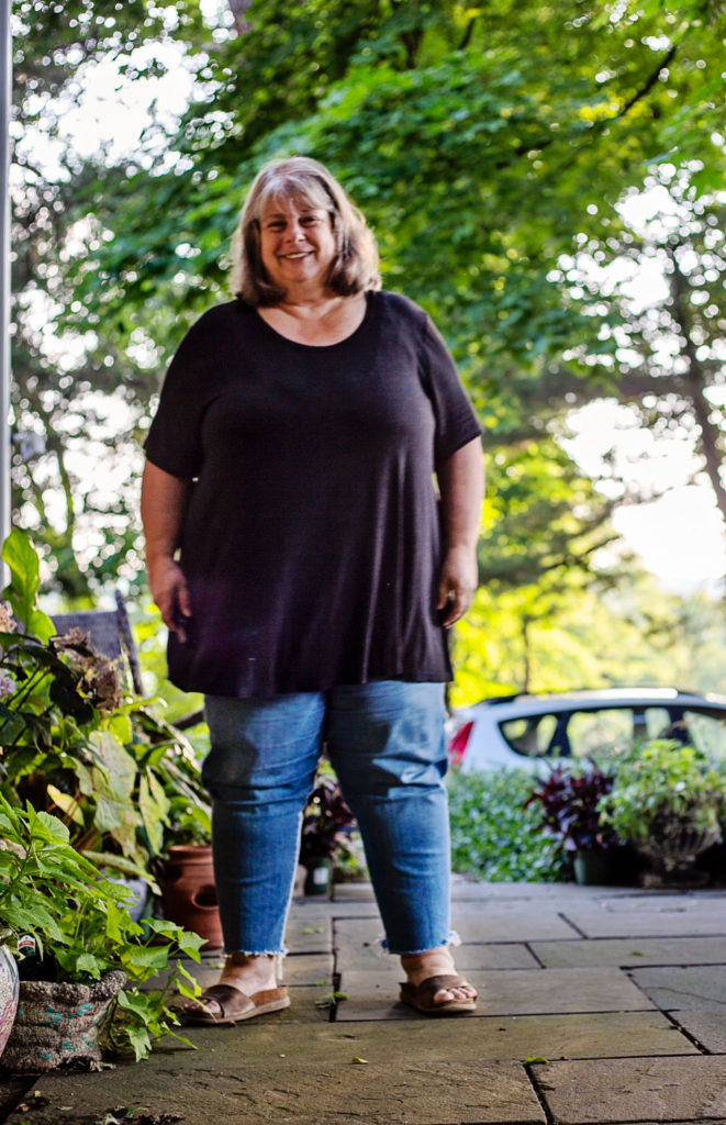 Anyway, black swing tee from Daily Ritual (NOT Daily Harvest), size 4x. Self-cropped Gloria Vanderbilt Amanda jeans, size 22w short. Old Mephisto slides. Hanes seamless wire-free bra, size 3x.