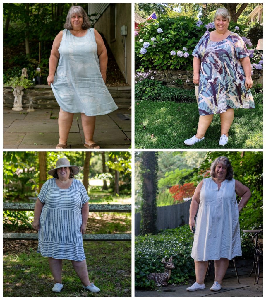 - Loose construction. No fitted waists, no body-con styles. No collars to sit against your neck and cause a sweaty touchpoint. No sleeves better than sleeves, loose flowy sleeved better than close-fitting. Re sleevelessness: guess what? My arms are fat. So what.