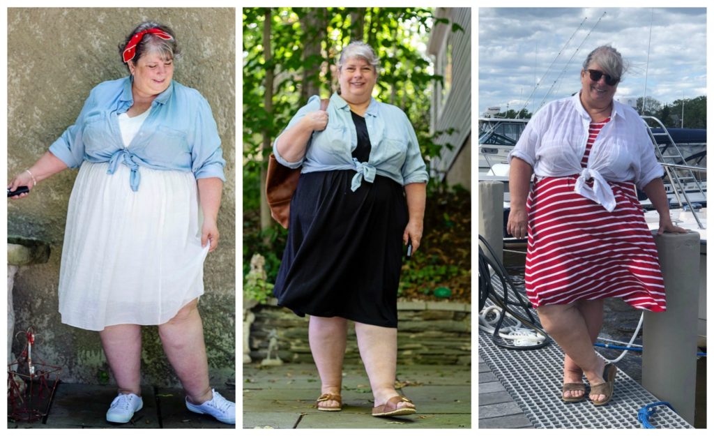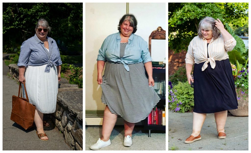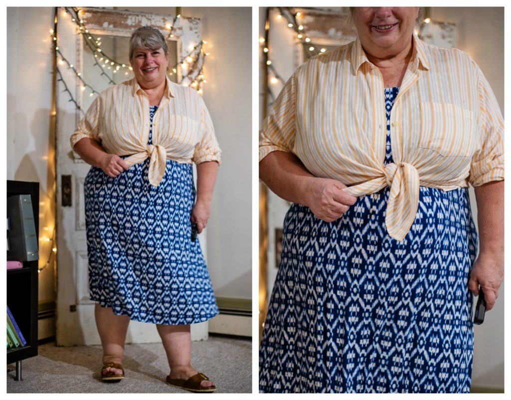 I like this idea and it looks really good on you. I have VERY few dresses but I think I could use the same idea with a skirt and tucked in tee shirt, then the shirt tied over the tee shirt. Gonna have to try that.