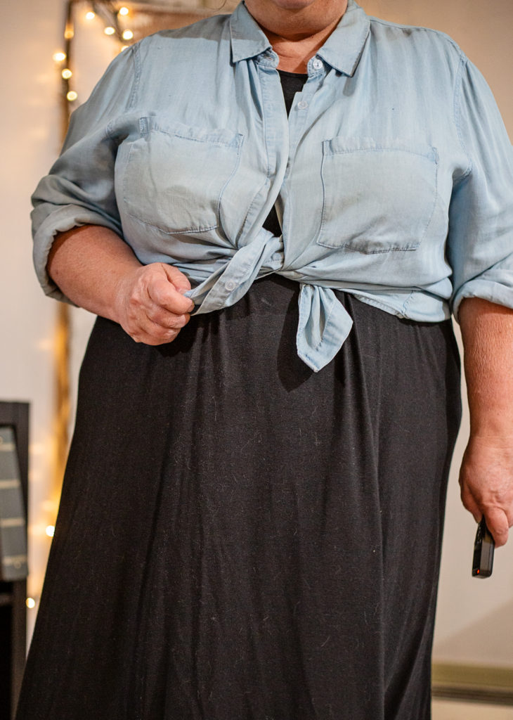 It’s a headless pic of you wearing a black dress with a light blue blouse tied and knotted over it. Your phone is in your lt. hand. We have cats, too, so I know how hard it is to keep up with their hair output…I just would want to check any dark clothing for cat hair before I took a pic.