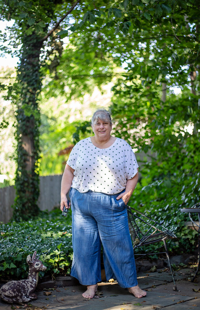 Anyway. It’s too bad about these pants cuz they are pretty much a delight to wear, but out in public? Nope. Been there, done that, am still plagued by nightmares. I so struggle with the “wide-legged, soft pant.” Should they be longer? Should they be shorter? Should they be buried in the backyard? And I hate an elastic waist pull-on pant without a real drawstring. They always slip and droop down so I get baggy crotch. They’re pulled up here…but I had to KEEP pulling them up and I was barely moving around. They’re tencel, so wonderfully light and drapey, so it’s a shame about the fit.