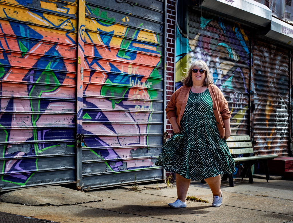 It looks a little more fitted with the sweater over it, holding it in a bit. But on its own it’s a LOT of fabric, the length is a little too long and the waist-seam a little low. It’s one of those I want pulled up at the shoulder seam by a couple inches, and that would lift everything to where it should be on my body. If I buy another of this same style dress from Osei-Duro next year I’ll size down one.