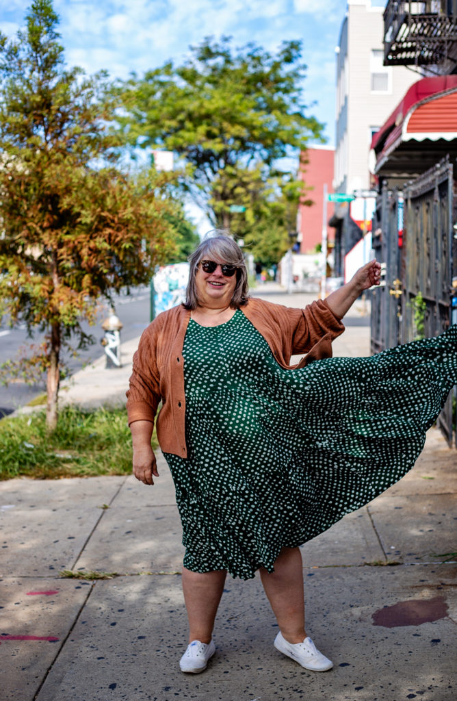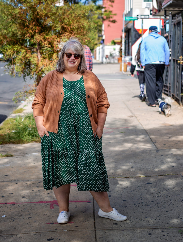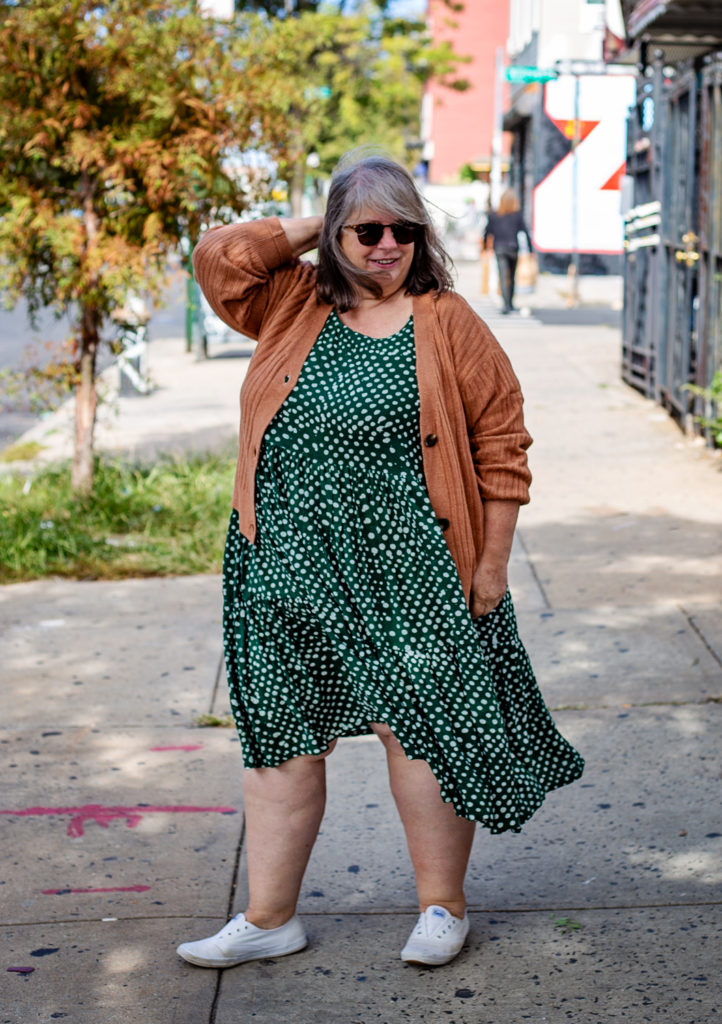 This is the Osei Duro dress I treated myself to this summer. And even though I never had it altered I LOVE it and have worn it a lot. I’m not ready to give it up so soon. But I can just throw a cozy cardigan over top and call it a day! When it gets even cooler I might put a super-thin turtleneck underneath and a cardigan over top. If I could find plus size cream tights (oh to dream the impossible dream) I could even see it with tights and clogs.