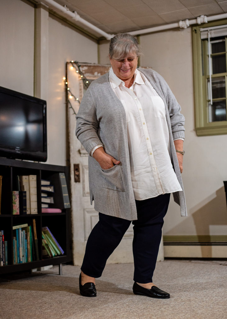 Cardigan: Grey Old Navy Longline Cardigan, size 2x. Exact sweater no longer available, but there’s a darker grey Old Navy cardigan here that’s just like my new brown one that I’m loving. Speaking of which, I think I’d like the brown cardigan with the navy pants.