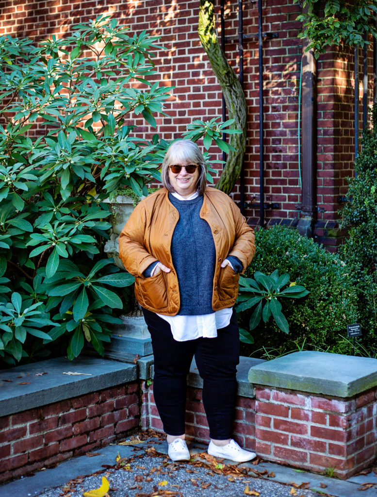 Fit has a lot to do with it. The loose, long tails of the white blouse…the boxy, slightly cropped shape of the crewneck sweater…they weren’t tight on my body so they had some movement and I didn’t feel constricted in any way, or like I had to keep adjusting, smoothing, tucking, etc. I like the loose upper layer over the slimness of the skinny jeans on the bottom. The cropped jeans allowed just a little glimpse of ankle…and the white sneakers (while still dirty!) are classic and perfect for walking. The coppery jacket has the same loose, boxy fit as the other top layers, and the collarless style has a minimal appeal to me.