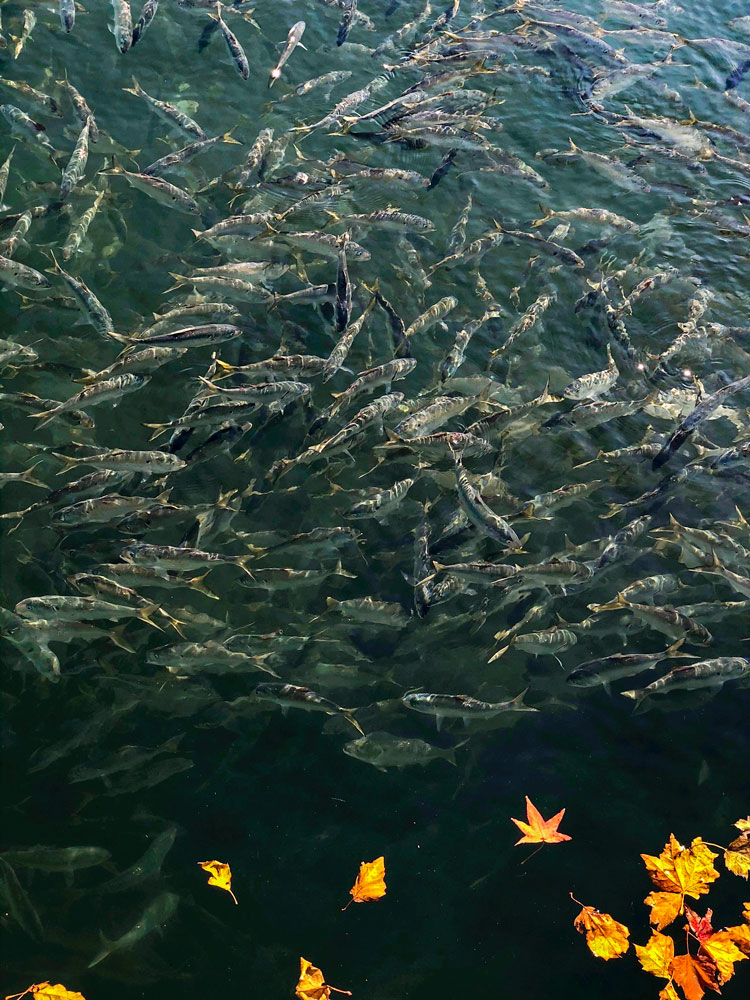 where is that water teeming with fish, and what type are they?
