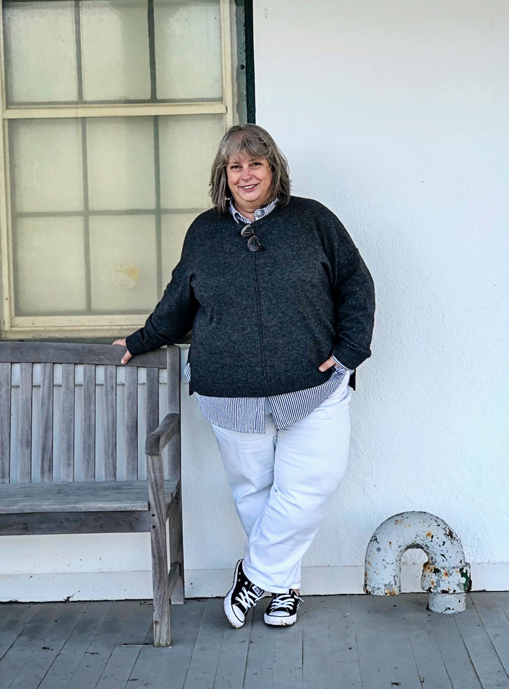 Bringing it back full circle to the formula I’ve got here..if this was just a sweater over jeans…it would be fine. But I think the layering and the little details of shirt peeking out at collar, cuffs, and bottom add a little sumthn sumthn.