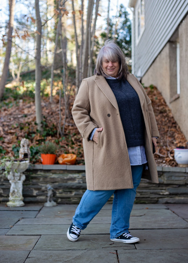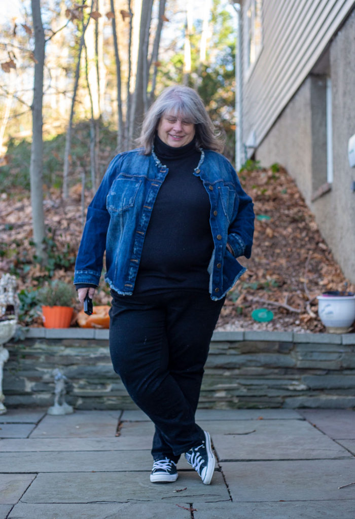 I have that black wool Old Navy coat, the cinnamon-colored liner jacket, and this denim one in that collarless style. I think they look so clean over a turtleneck. And I love a turtleneck.