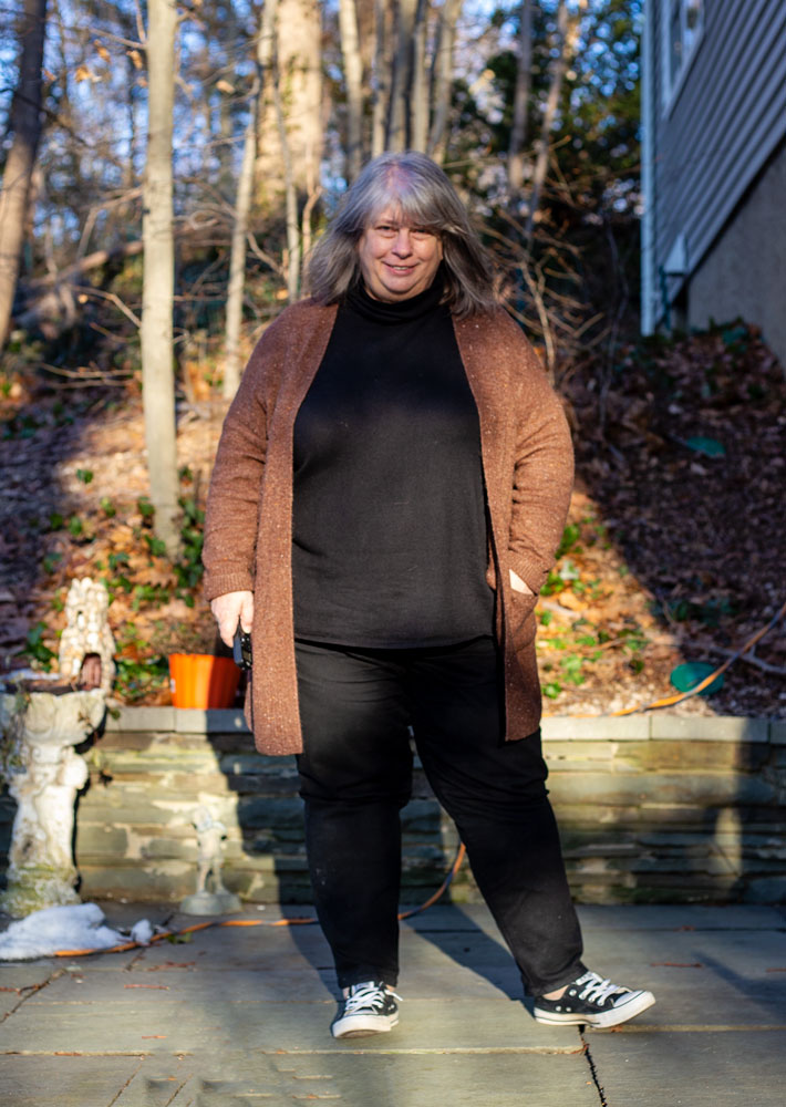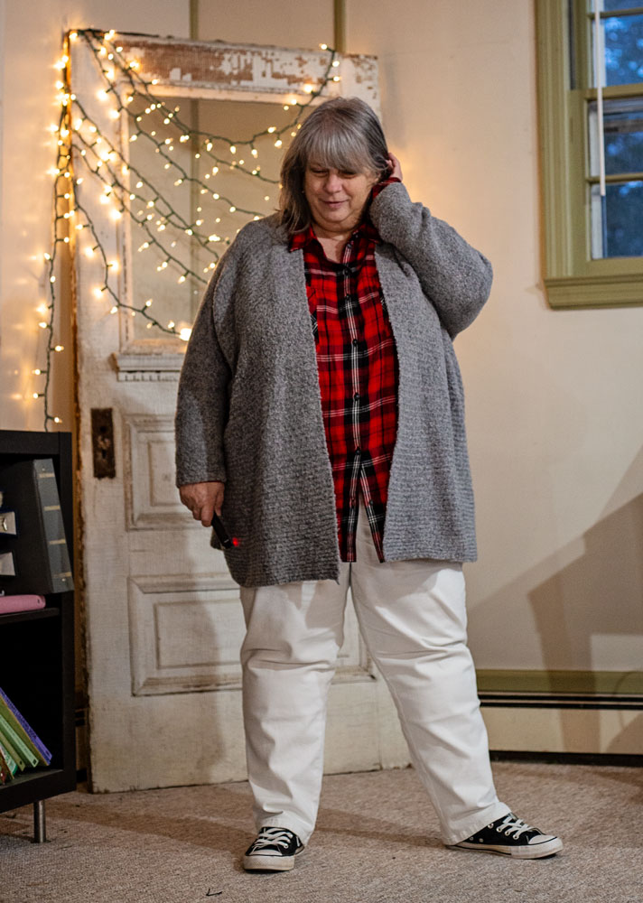 Honestly not a huge fan of this combo. I think I’d like a darker grey cardigan better. I JUST found an old (really old) grey cardigan but it’s so crumpled and smelly from being trapped in a plastic bin for a long time. Once I wash it I’ll try that over this blouse (ha ha) and see if I like that better. It might be a little small for wearing over this shirt, but I’ll give it a try.