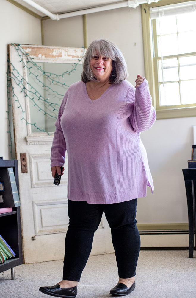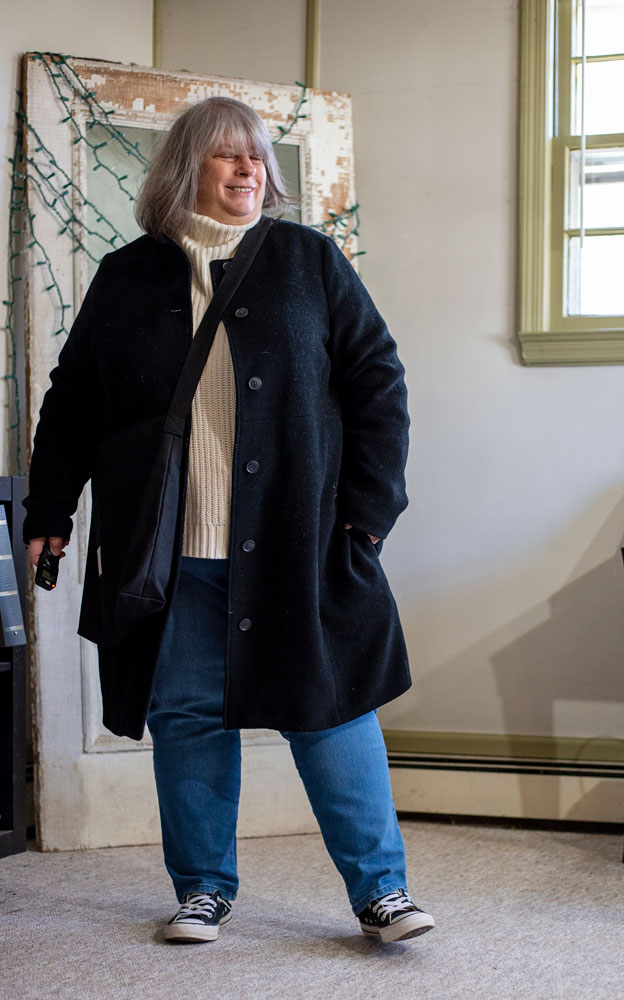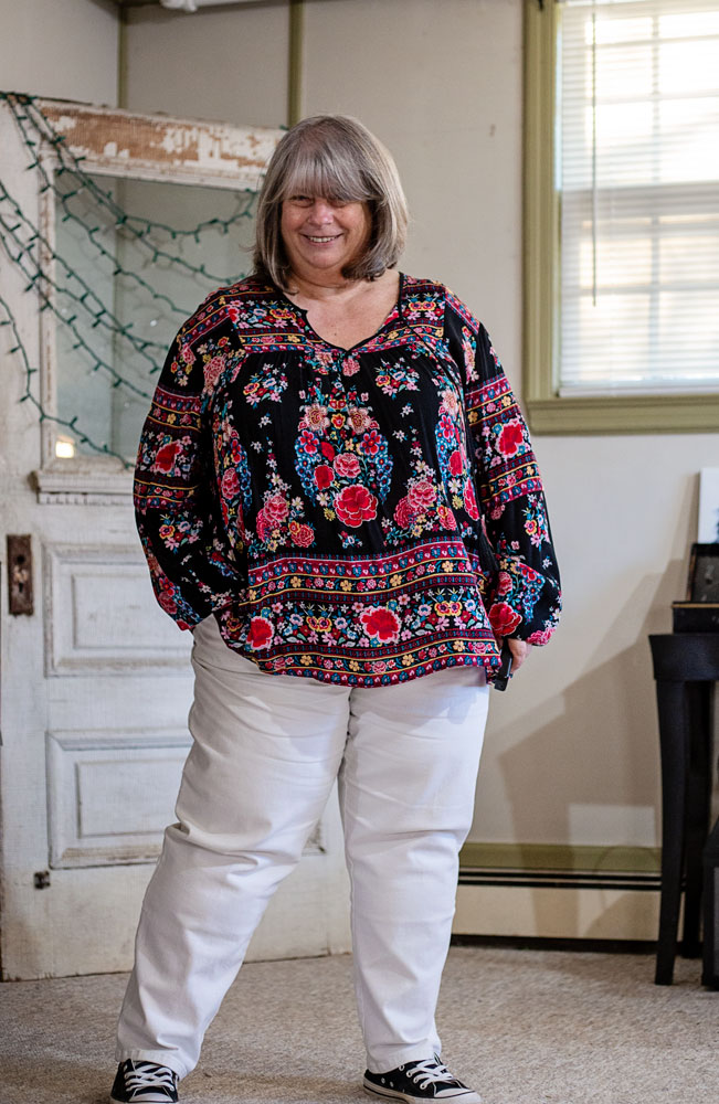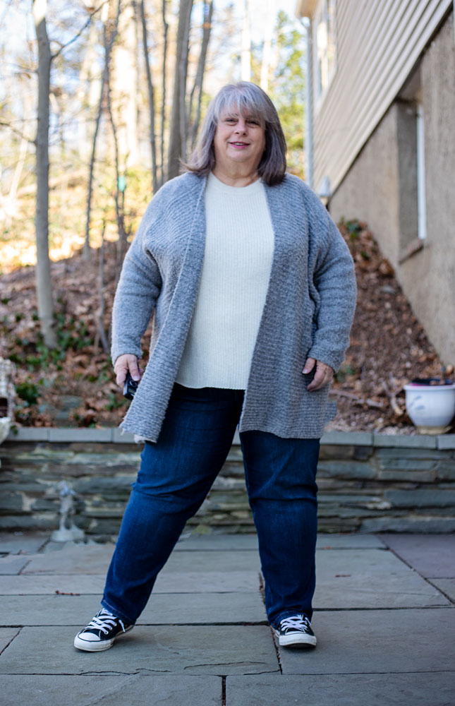 Same weather issues here in the NW. I tend to opt for being too cold over too warm if at all possible. I really like the color combination, proportions and fit of Mondays outfit. As far as sleeve length goes I would just roll up the cuff on any that are a bit long to keep me from fussing at them all day. Also love the new colors on you, and the bohemian top is special. I love the flowy hippie styles of the 60’s. I was in grade school at that time and Mom had a whole other idea of what I should wear. I still look for things that remind me of the style.