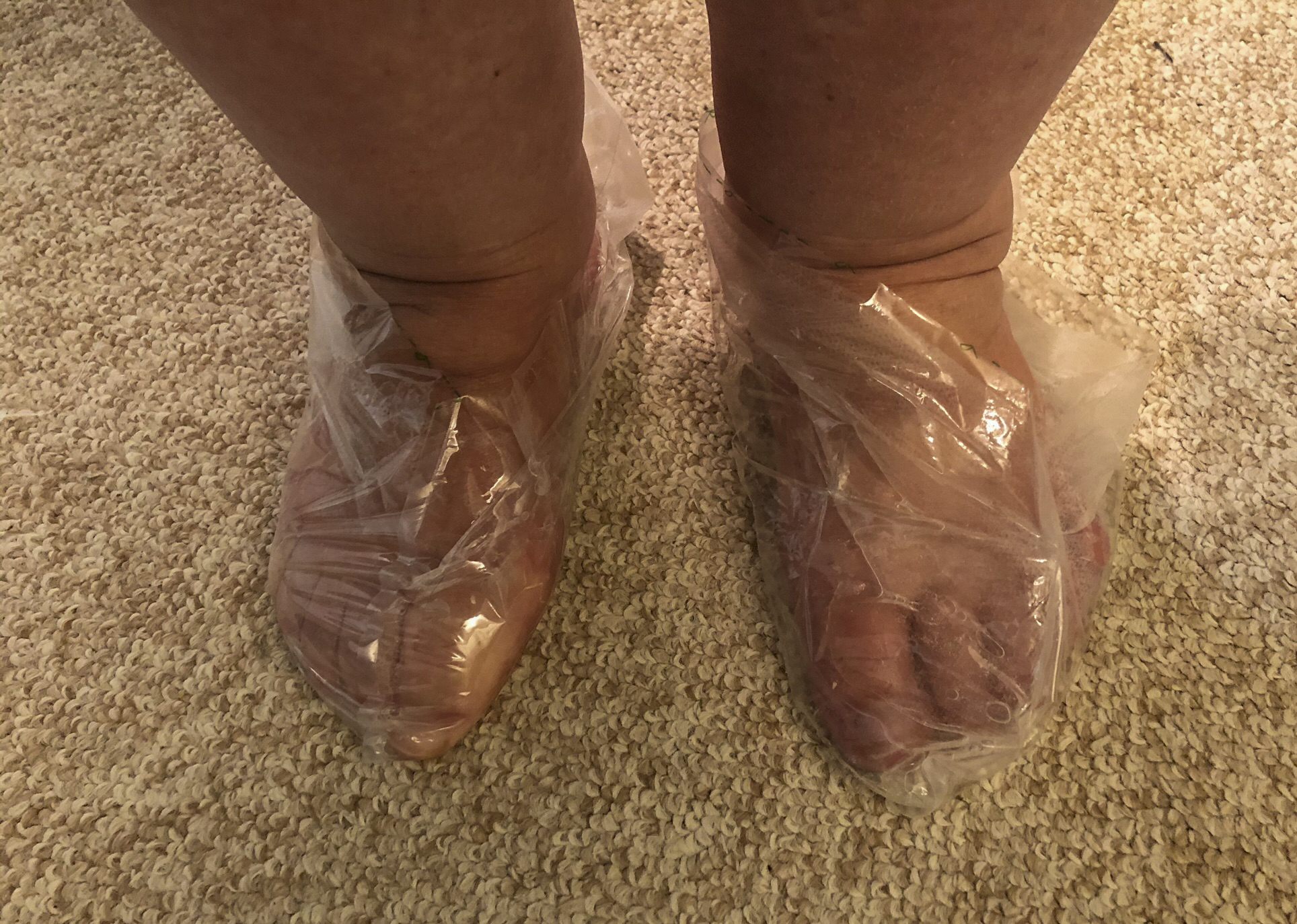 So here I am with my tootsies bound up in plastic bags waiting for the miracle to happen. It was a challenge to get into the goop-filled plastic sock-booties but I managed, more or less. It’s suggested you put socks on over top of the plastic booties but. That is not within the realm of possibility for me, so I just sat stock still for the hour so nothing squished out and my feet stayed in.