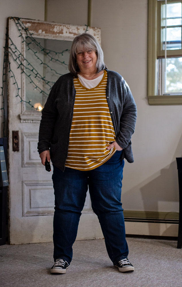 I woke up wanting to wear this striped tee. But I wanted something else over it for running out to get breakfast (my big social outing of the day OH how small my life has become). I like the stripe on stripe. The wider horizontal stripe with the narrower vertical stripe. I think it works because they’re both coolish colors (the grey and the taupe)..,and the whites are almost the same…and the necklines play nicely with one another – they’re both sitting up pretty close to my neck.