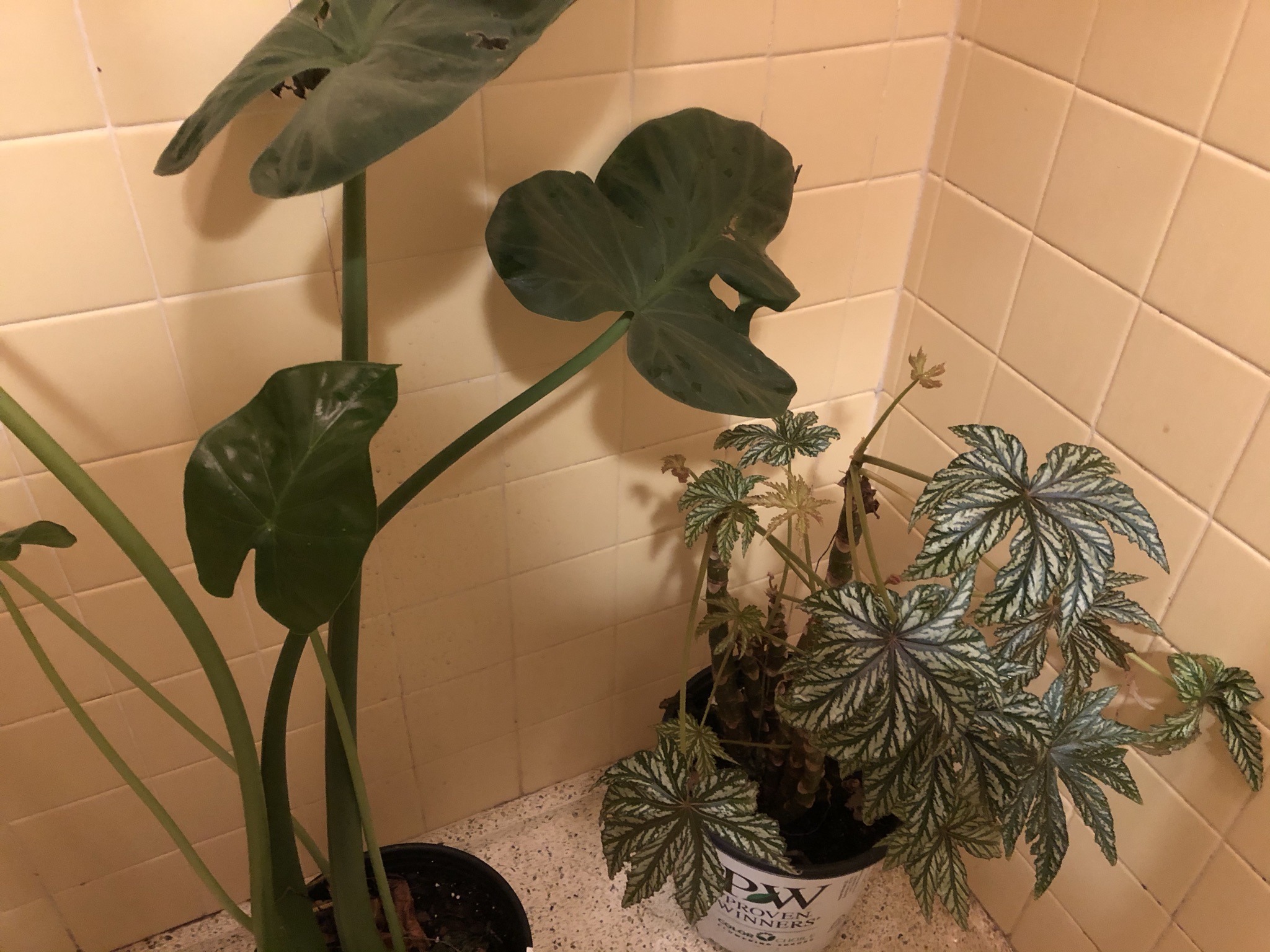I never even set up the grow lights. They lived in the bathroom all year (we were a little crowded in there!) so it was easy to plop them in the shower for bath time. The elephant ear guy on the left is a little loose in the pot…and his new growth is a little spindly cuz there’s not good light in there. I guess I need to repot and stake him up. Any planty types out there have any advice for me?