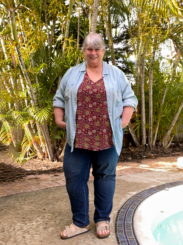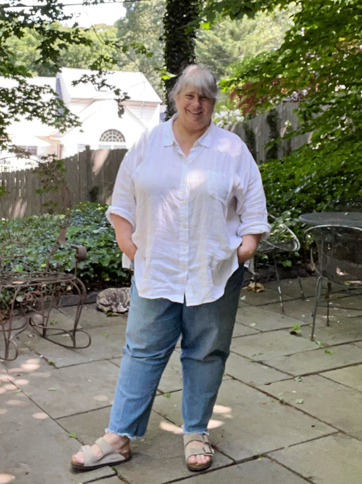 Oversized linen shirt for coolness and comfort…heaviest jeans to keep luggage weight done, and heaviest/easiest to slip on-off at airport sneakers. Carried my lightweight tencel hooded jacket in case plane was cool (which it almost always is).