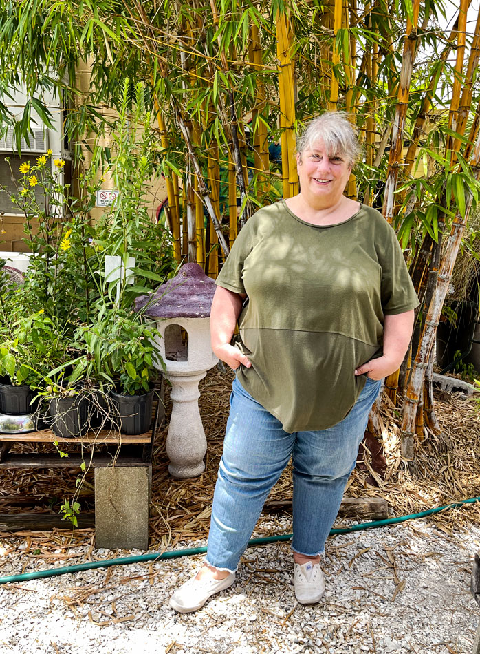Headed back out into the world today: a sunken garden in the afternoon, then dinner near the beach, then beach sunset, so…a lot of HOT. Walking in the garden made me choose comfy but old sneakers and the sleeveless rayon top. The cropped baggy jeans are the coolest (relatively speaking) pants I have here, so…