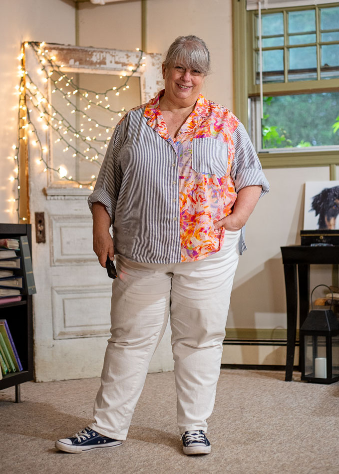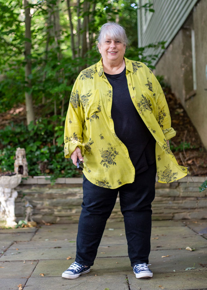 But I digress. Easy. Two-piece outfit easy to put together…and this top has “ease of fit.” It’s a little oversized and the fabric is soft, like it’s been washed many times.