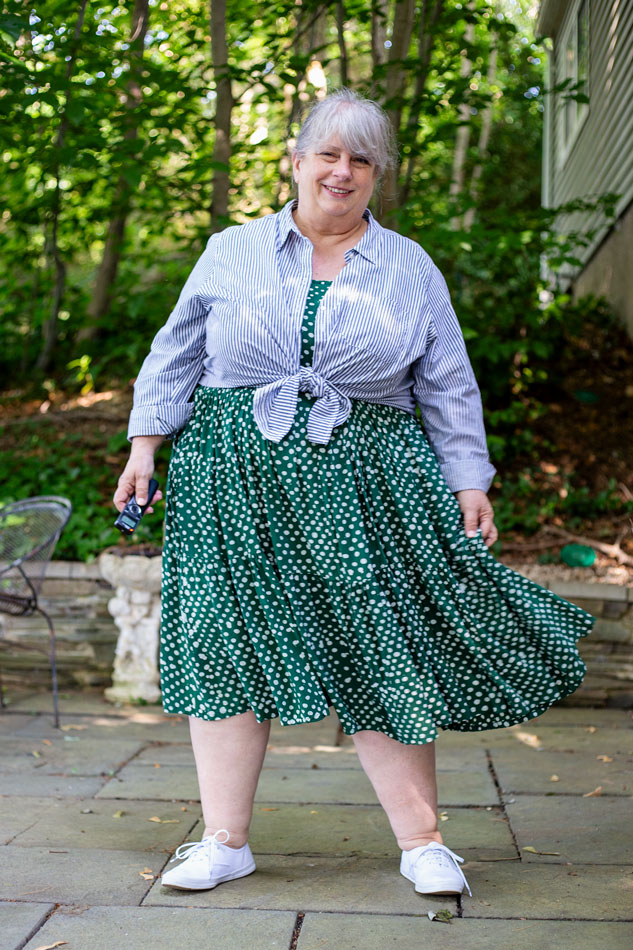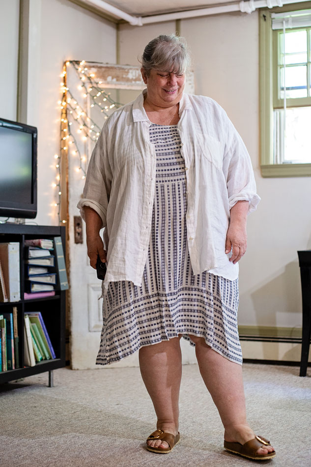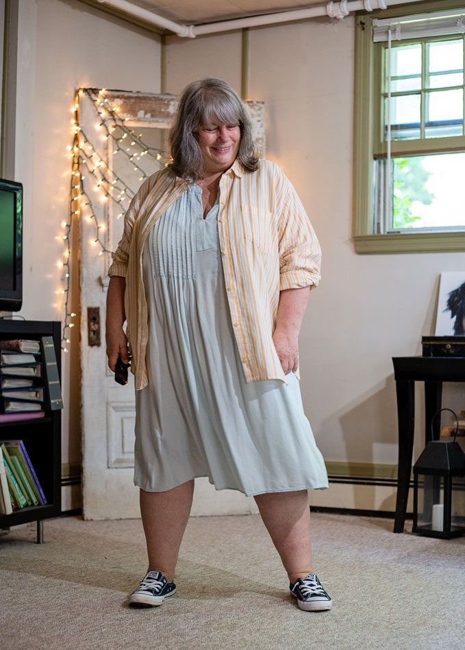 I call this look Hot Weekend Casual. Hot in the sense of high temperature. We’re nearing that time of year when I don’t so give a you-know-what about what I’m wearing, when I don’t have to. So it’s all my natural fiber, loose-fitting dresses, with a light button-down worn open over the top.