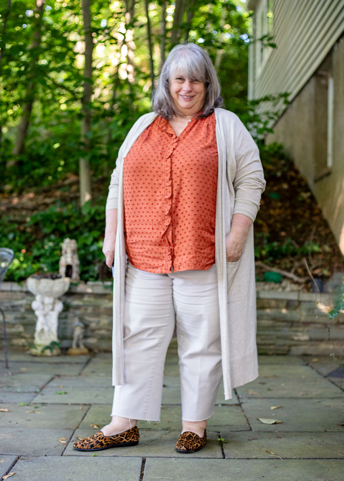 And the leopard shoes were a last-minute switch-out. I’d been wearing those chestnutty flats (that someone here calls the cow patty shoes, ha ha) with these jeans in the warmer months and the combo always felt a little off to me. I think the shoes have a yellowy (warm) undertone…and the cardi and jeans are more to the grey side of cream/beige and read a little cooler to me.