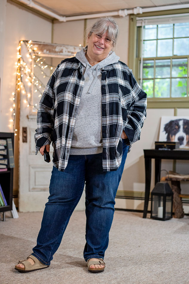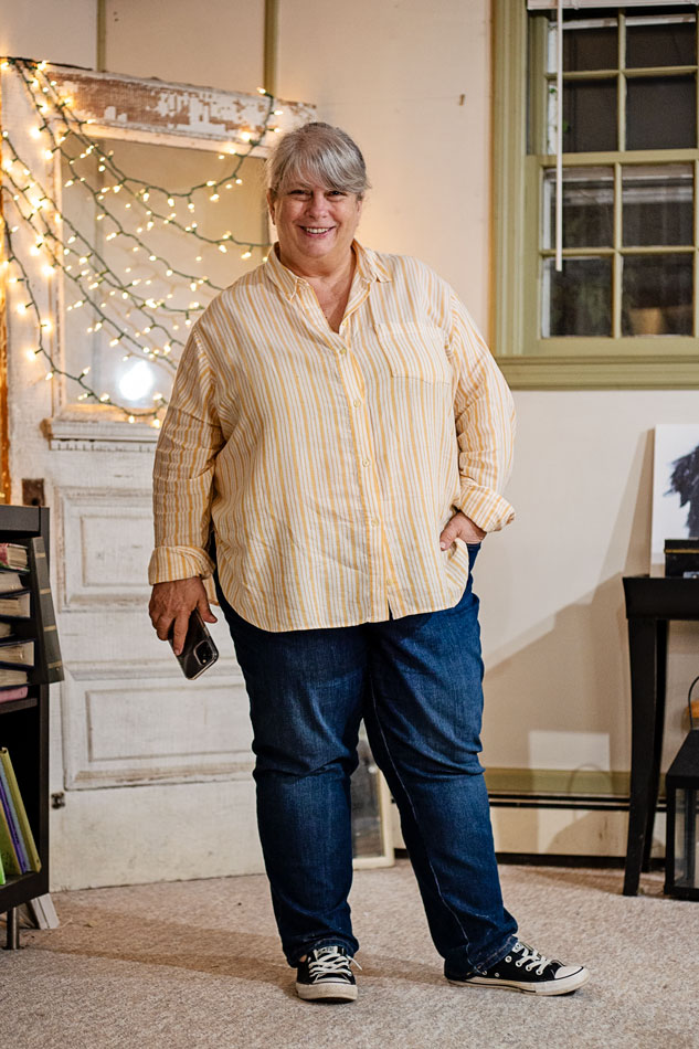So not wearing anything precious, for sure. Dark wash jeans and black sneakers that won’t show wet marks. T-shirt with loose unbuttoned blouse over top so I have a layer to take off if I get rained on.